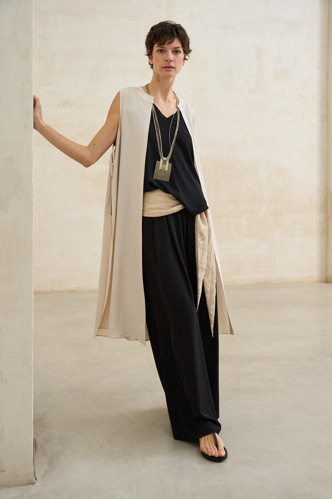 El chaleco Mireth hueso es una prenda ligera y estructurada que aporta sofisticación relajada a cualquier conjunto. Confeccionado en tejido fluido de caída suave, presenta un diseño sin mangas y silueta abierta que estiliza visualmente la figura y permite jugar con las superposiciones.