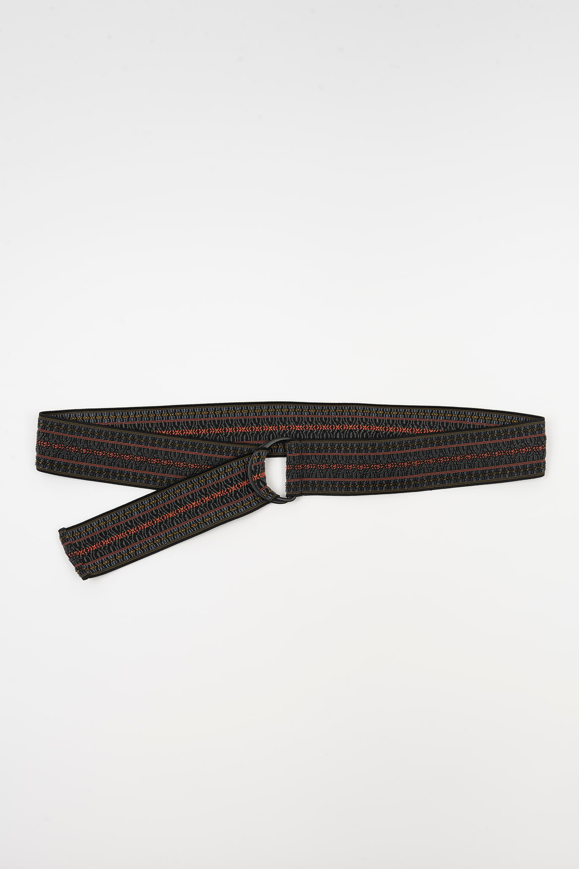This belt is a versatile accessory with an ethnic yet contemporary touch. Its jacquard design in intense tones on a black base adds texture and depth, while the color combination—red, blue, yellow, and gray—makes it an easy piece to integrate into fall-winter looks. The metal ring closure allows it to be comfortably adjusted to the waist or hip. Perfect for elevating understated styles with a touch of color and personality.