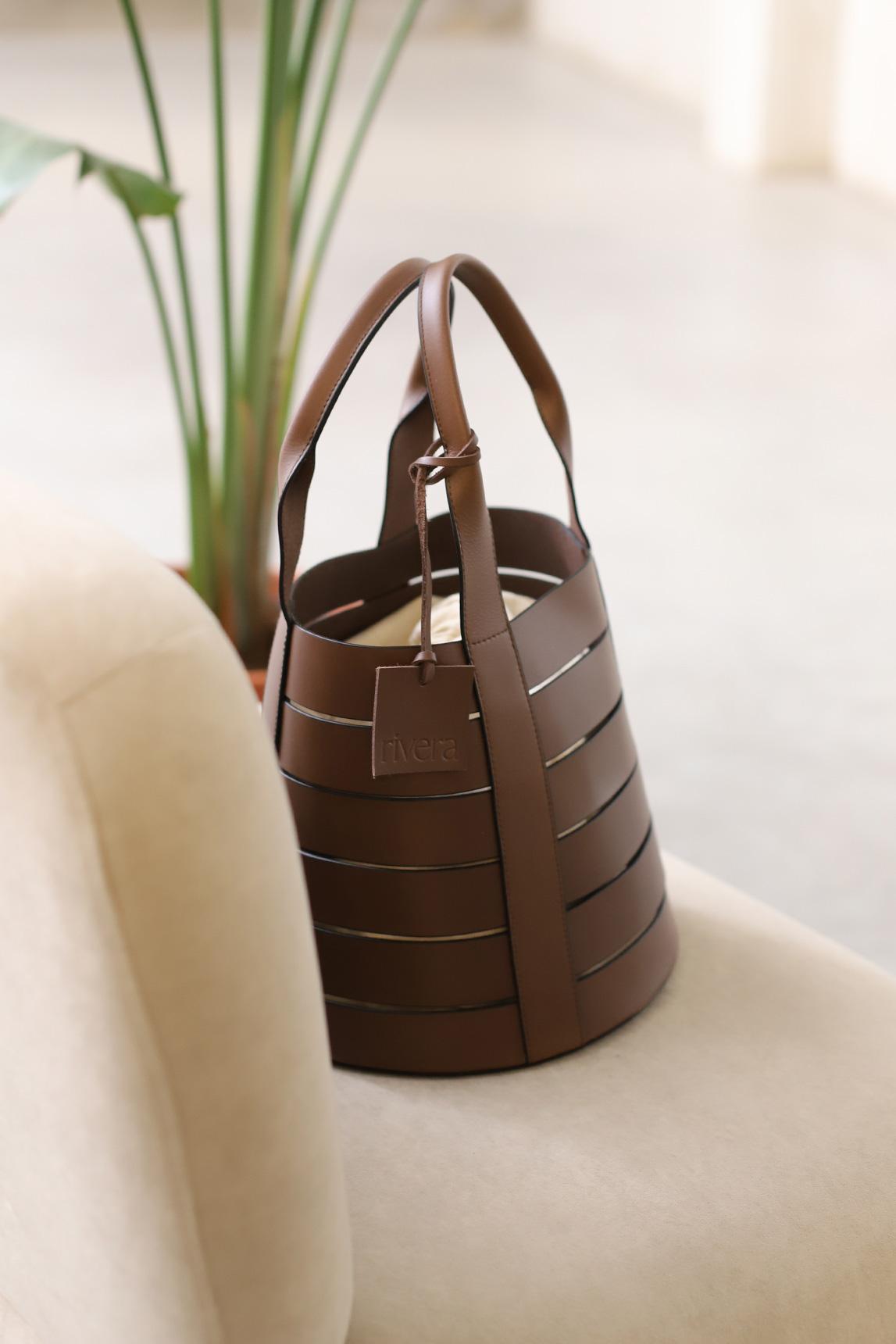 A chocolate brown leather handbag, a sophisticated and timeless version of the classic model. Its deep color reinforces the structured character of the design, making it an elegant and versatile piece that can be worn year-round. The bucket bag with horizontal bands adds visual texture and a contemporary aesthetic. The long handles allow it to be carried comfortably over the shoulder, maintaining a defined and polished silhouette. Measuring 17 x 12 x 10.5 cm and with a 7 x 5.5 cm handle, it is a compact bag but with enough capacity to accompany your daily routine in style. An ideal choice if you're looking for a structured brown leather bag with presence and a distinctive design. We strive to display colors as accurately as possible, but they may vary slightly from reality.