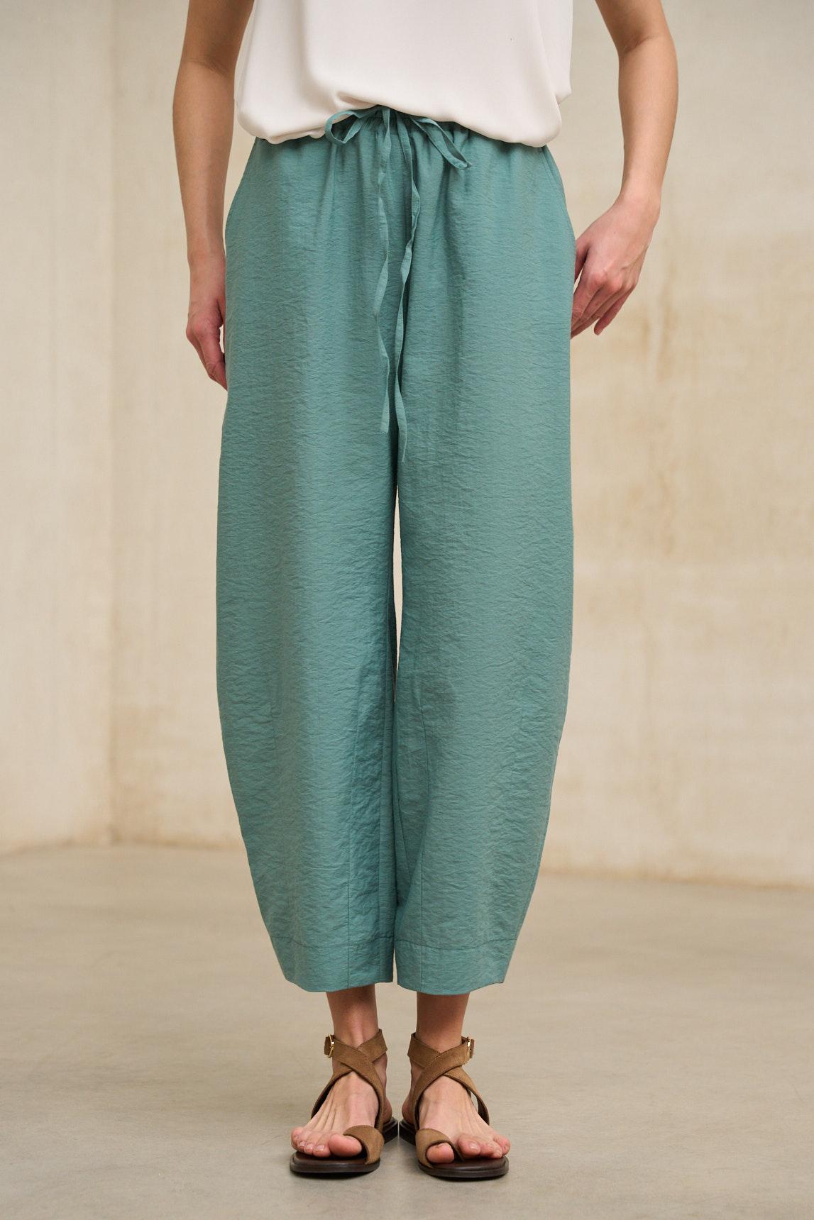 Women's trousers crafted from a lightweight fabric with a natural texture and soft drape. They feature an elasticated waistband with delicate ruching and a wide leg that is slightly tapered at the hem, creating a relaxed silhouette with controlled volume. Discreet side pockets provide functionality without disrupting the clean lines of the design. The Éldan turquoise trousers exude freshness and serenity. Their soft, natural tone pairs easily with off-whites, ecru, or sandy shades, making them ideal for spring outfits with a relaxed yet sophisticated feel. The flared silhouette adds a contemporary touch without sacrificing comfort. Perfect for everyday life, travel, or informal plans where spaciousness and movement are desired without sacrificing a refined aesthetic. We strive to display colors as accurately as possible, but they may vary slightly from reality.