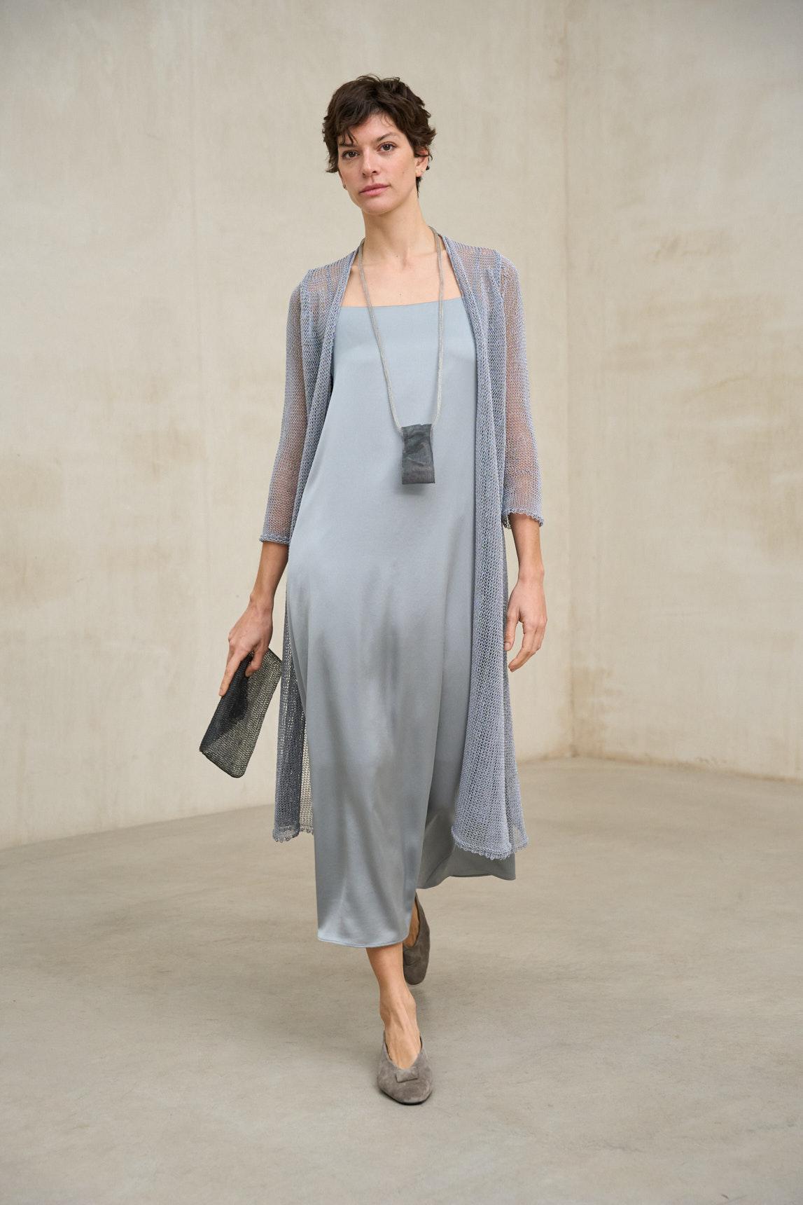 The Soreya smoke blue dress is a piece with clean lines and minimalist aesthetics, crafted from lightweight fabric with a fluid drape. Its design, with delicate straps and a subtly curved straight neckline, enhances the shoulders and collarbone with subtle and contemporary elegance.