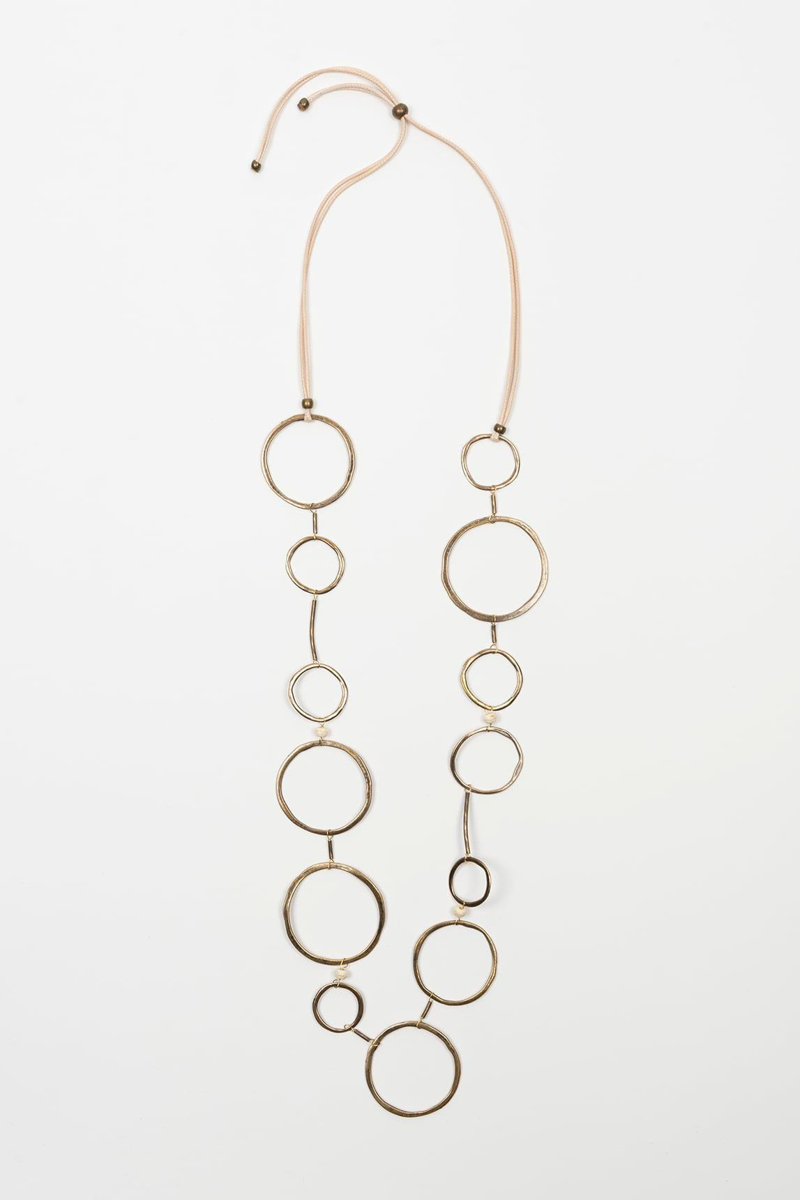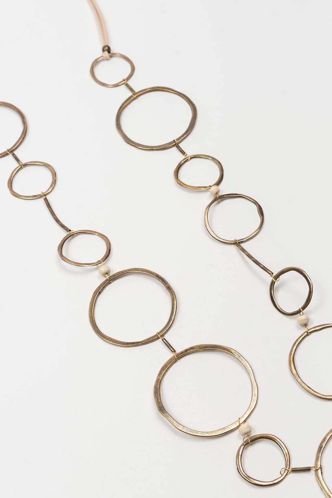 The Ciranel necklace stands out for its long, geometric design, composed of a succession of metal rings of varying sizes that create a dynamic and elegant visual rhythm. Its lightweight structure allows for natural movement while walking, adding sophistication without rigidity.