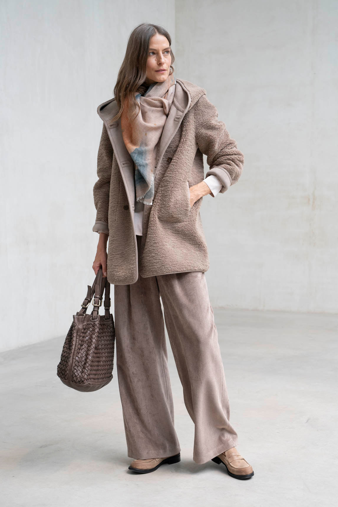 The reversible taupe Sirmione coat combines warmth, versatility, and timeless design. Its double-sided construction allows you to easily adapt it to different occasions: a more relaxed look with the shearling side visible or a more sophisticated style with the suede-effect finish. Ideal for cold days, this coat will complement both casual outfits and more elegant combinations. With its wide hood and button closure, it's a must-have piece for the fall-winter season.