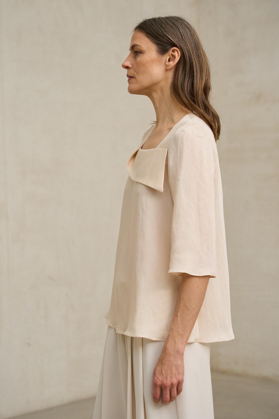 The ecru Yaren Blouse stands out for its fluid design and layered structure that adds depth and movement to the outfit. Made from lightweight, soft-draping fabric, it features a rounded neckline and wide elbow-length sleeves, creating a relaxed and elegant silhouette.