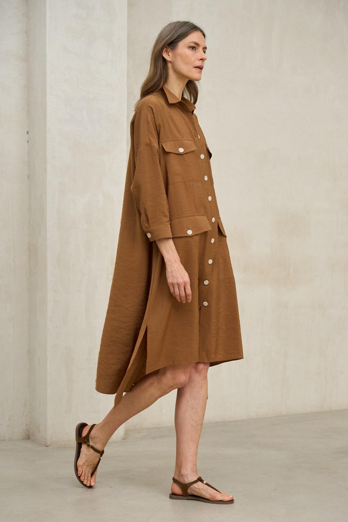 The Maëron copper tunic dress is a utilitarian-inspired piece that combines structure and fluidity in a contemporary design. Made from a lightweight fabric with a natural feel, it features a shirt collar, a front button closure, and patch pockets with flaps that enhance its functional character.