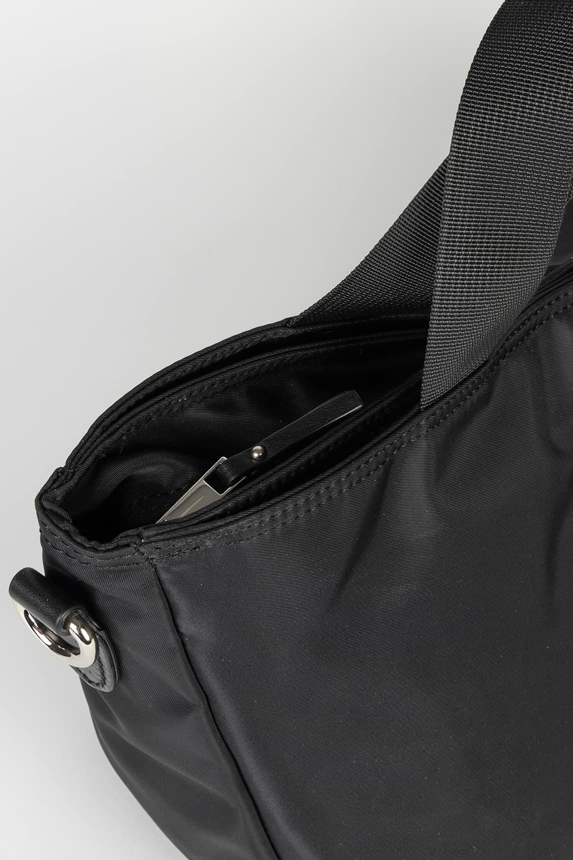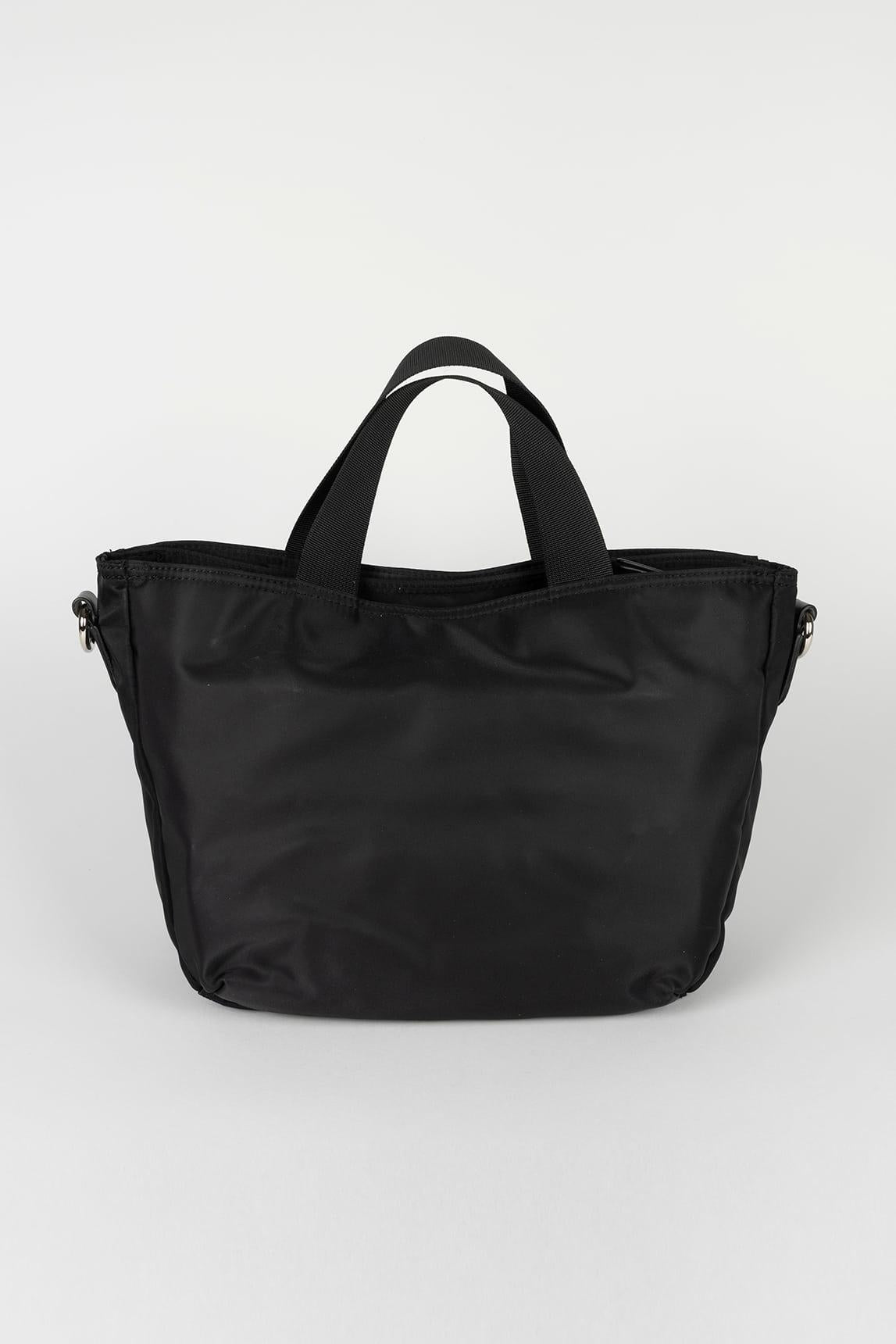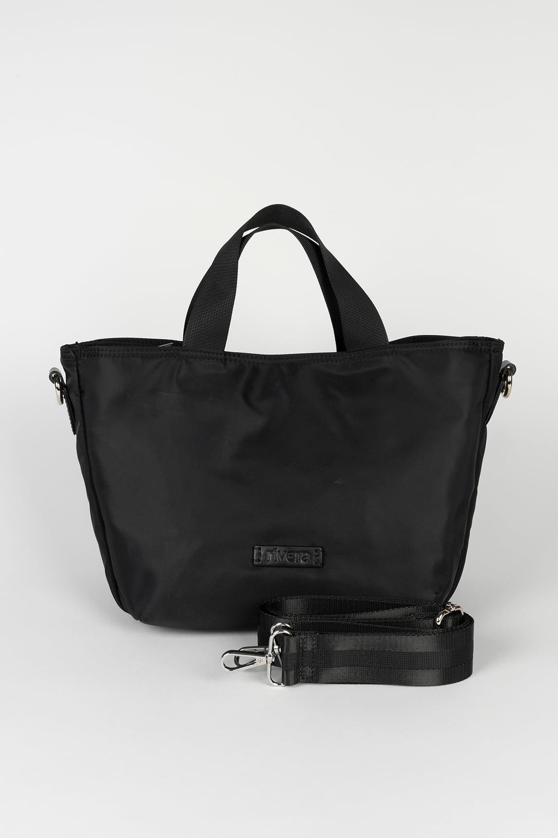 Bolso de mujer en nylon negro con silueta amplia y estructura ligera. El diseño incorpora asa superior reforzada y bandolera extraíble y ajustable, ofreciendo diferentes formas de uso según la ocasión. El cierre superior con cremallera y los detalles metálicos completan una estética funcional, mientras la superficie lisa aporta una imagen sobria y contemporánea.