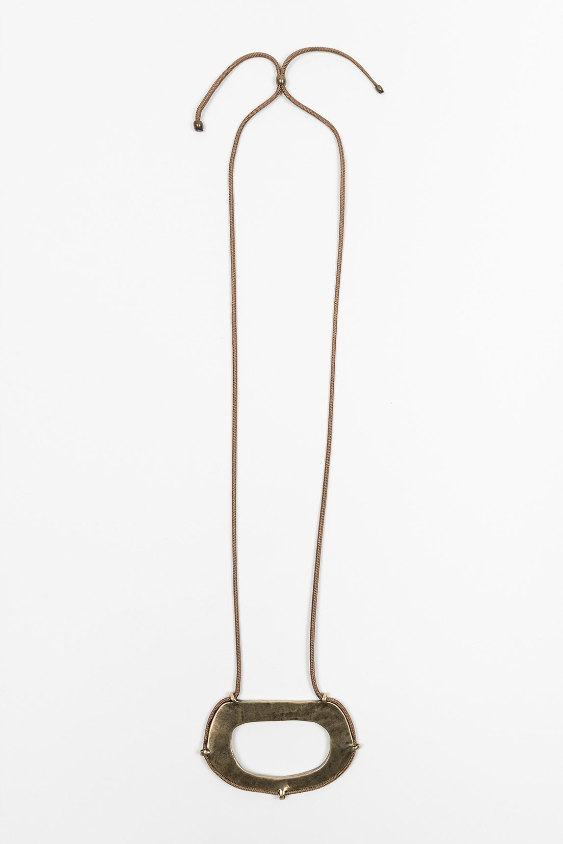 Collar largo con pieza central metálica de diseño orgánico, con forma ovalada calada y bañada en latón envejecido que aporta un toque rústico y contemporáneo a la vez. Su estructura robusta pero visualmente ligera lo convierte en un accesorio con carácter y equilibrio.