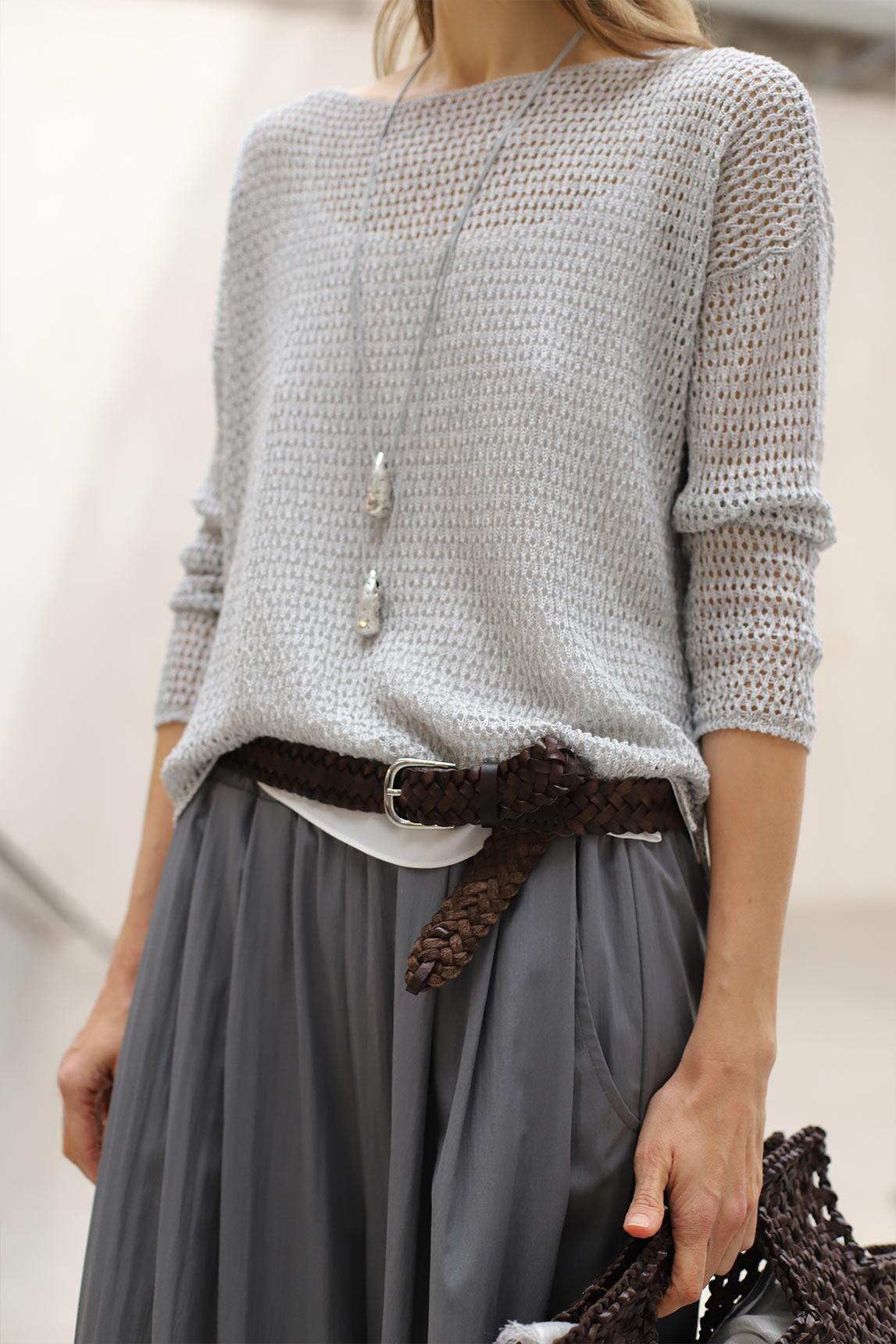El marrón es un básico imprescindible que armoniza con camel, arena, crudo o verde oliva, reforzando una estética natural y equilibrada. Puede utilizarse para marcar la cintura en vestidos o para completar estilismos con pantalones estructurados, aportando coherencia y continuidad cromática.