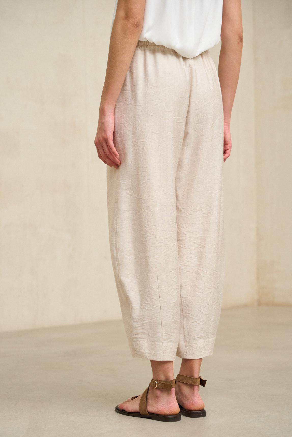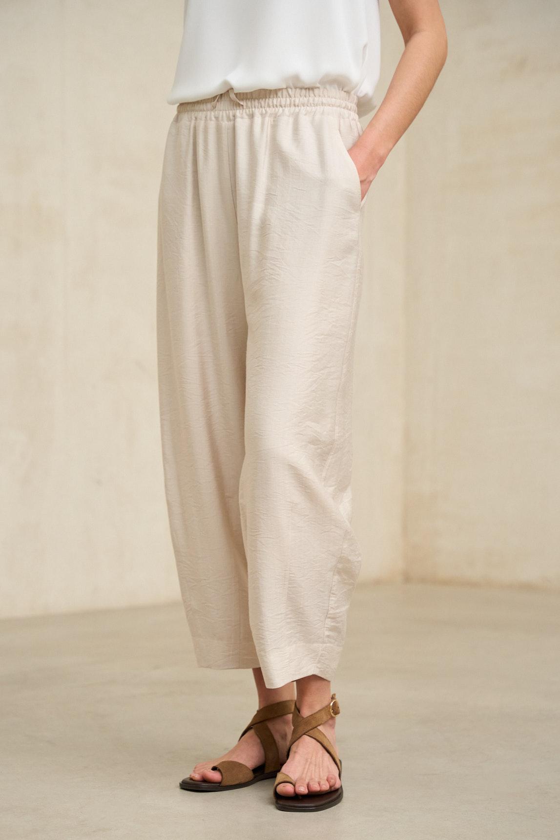 Pantalón de mujer confeccionado en tejido ligero con textura suave y movimiento natural. Presenta cintura elástica con fruncido y silueta bombacho, con pernera amplia de volumen controlado que estiliza la figura manteniendo confort. Incluye bolsillos laterales discretos integrados en la costura.
