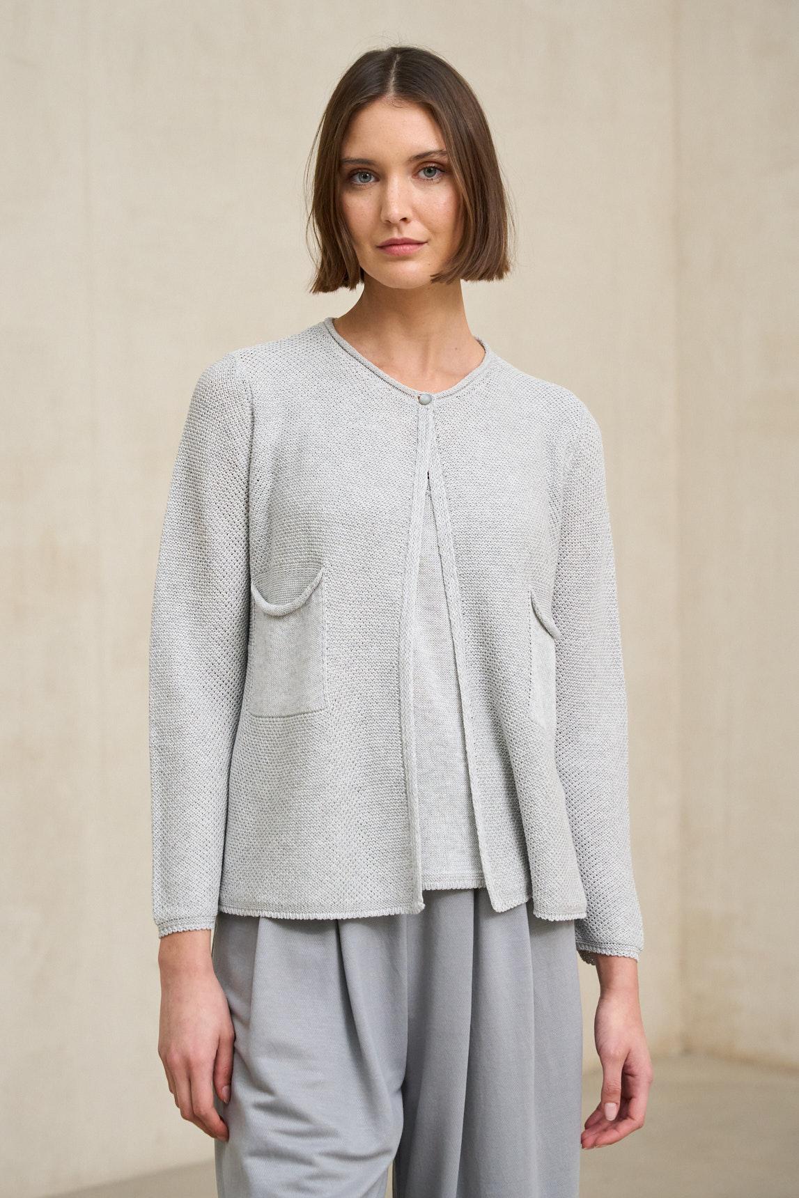 La chaqueta de punto Lierne gris claro es una prenda de mujer confeccionada en tejido de punto ligero de tacto natural y estructura flexible. Su diseño sin solapa, con escote redondeado y cierre frontal con botones al tono, mantiene una línea limpia y actual. La caída suave y el ligero volumen en el bajo aportan dinamismo y una silueta favorecedora sin marcar la figura.