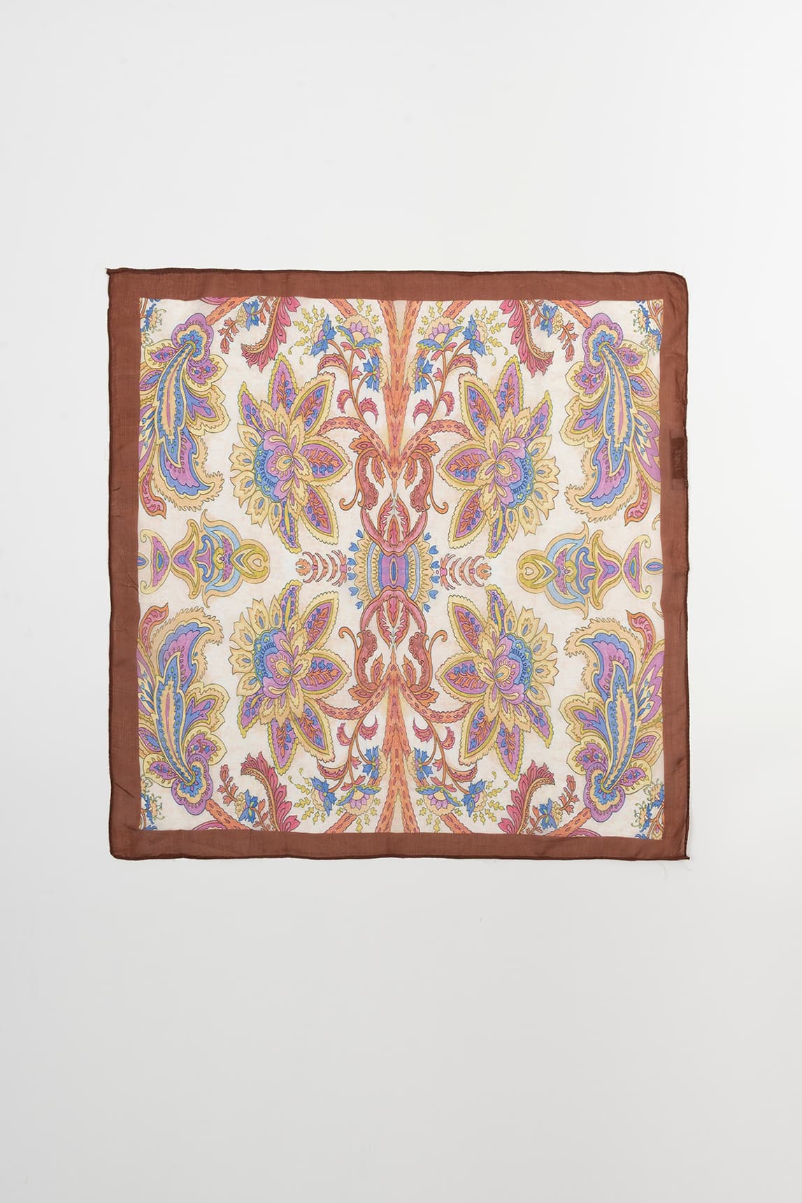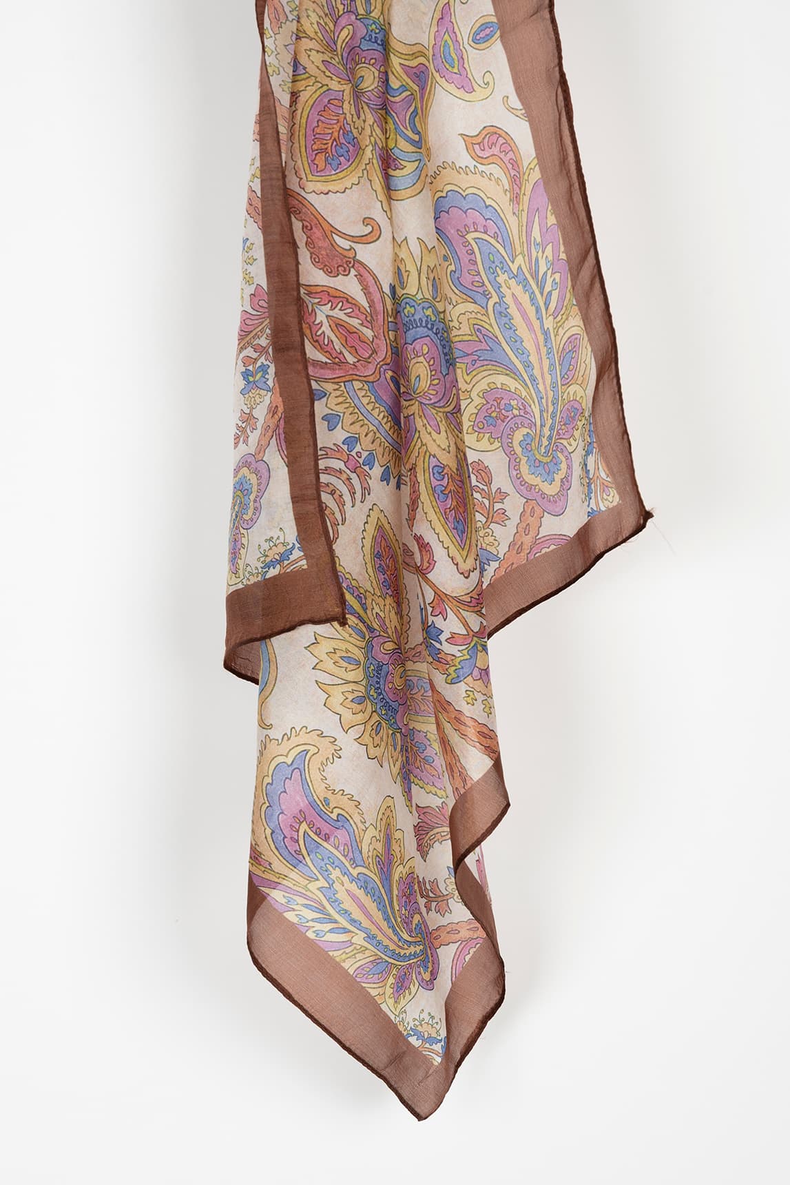 Pañuelo ligero de tacto suave y caída fluida, con base beige y un estampado paisley de inspiración clásica en una mezcla armoniosa de malvas, azules, mostazas y tejas. El diseño se enmarca con un borde ancho en marrón chocolate, que aporta contraste y un acabado elegante.