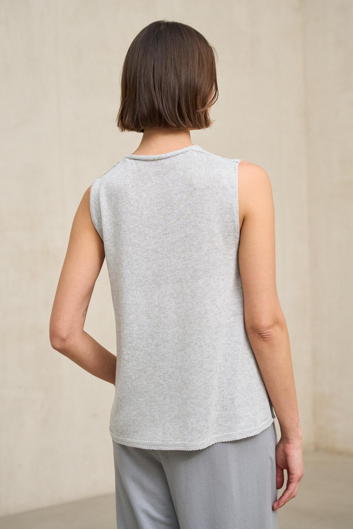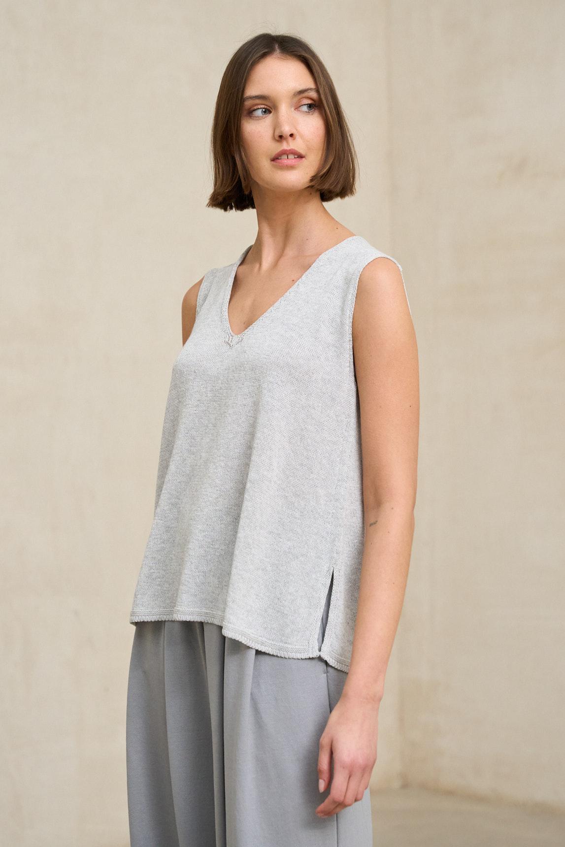 El top de punto Virel gris claro mantiene su esencia minimalista con un matiz suave y cálido que aporta aún más naturalidad al diseño. El escote en pico está terminado con un delicado ribete de gasa que añade ligereza y un detalle sutilmente femenino sin recargar la prenda.
