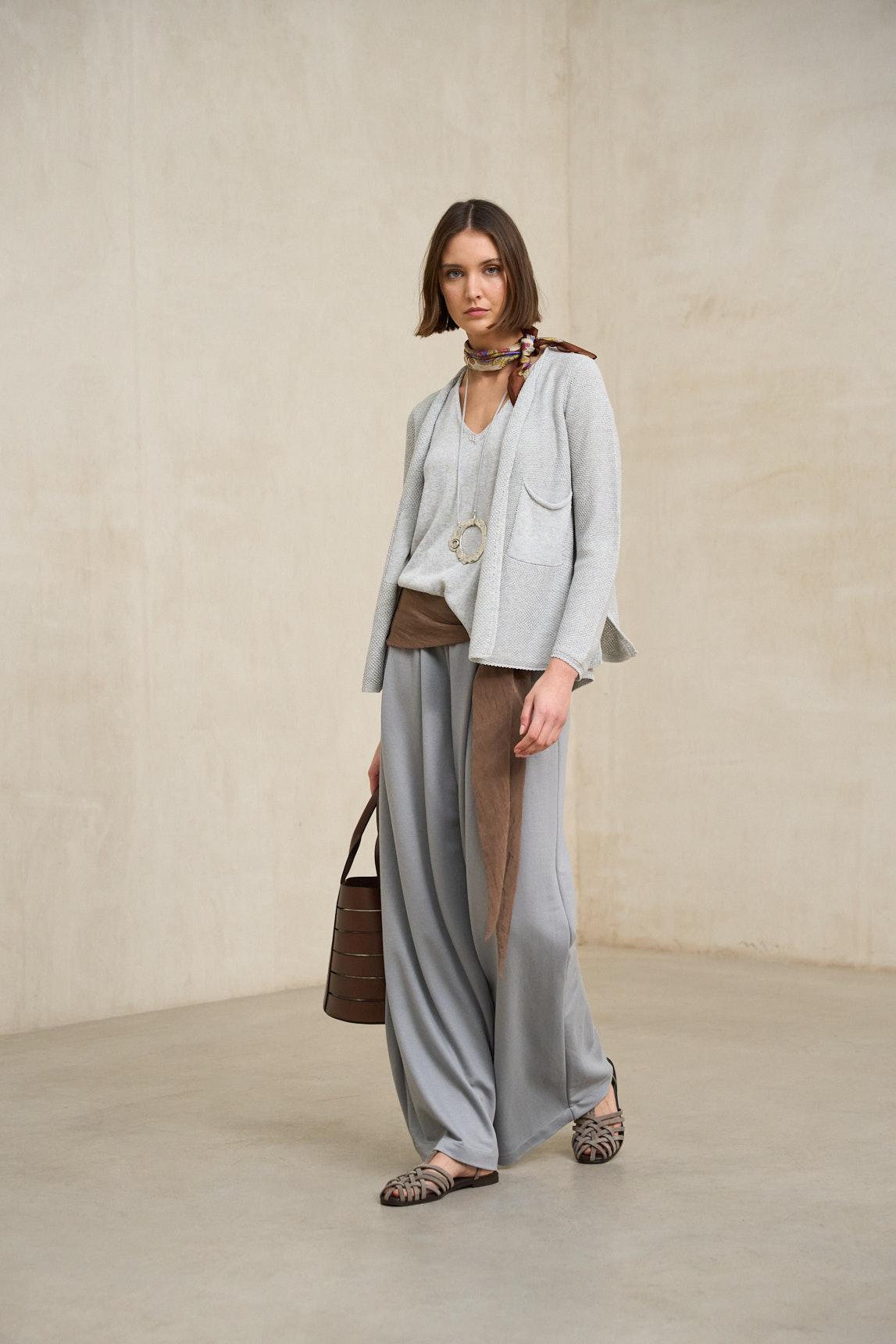 Confeccionado en tejido de punto fluido y de caída suave, presenta un corte ligeramente acampanado que favorece la silueta y aporta movimiento. El tono gris claro, cálido y versátil, encaja especialmente bien con blancos rotos, tonos tierra, azul marino o estilismos monocromáticos en gama neutra.