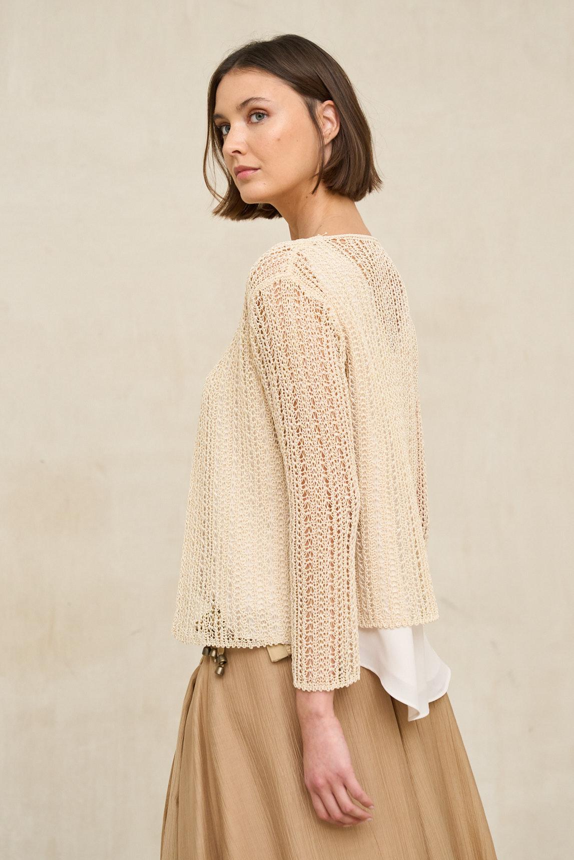 Chaqueta de mujer confeccionada en punto ligero de textura calada, con un acabado delicado y luminoso. Su diseño abierto, sin botones ni solapas, favorece una silueta limpia y estilizada, ideal para completar estilismos minimalistas. La ligereza del tejido crea un efecto visual sutilmente translúcido que aporta dinamismo y un aire refinado. Se recomienda llevarla sobre una prenda interior coordinada (no incluida) para potenciar su juego de capas. En beige suave, se convierte en una pieza neutra y versátil, perfecta para armonizar con blancos, arenas o tonos tierra claros en looks de primavera y verano. Nos esforzamos por mostrar los colores de la forma más fiel posible, pero pueden variar ligeramente respecto a la realidad.
