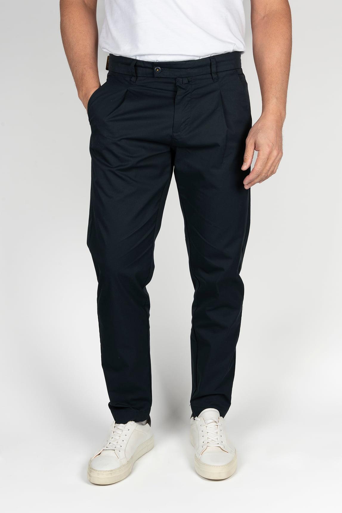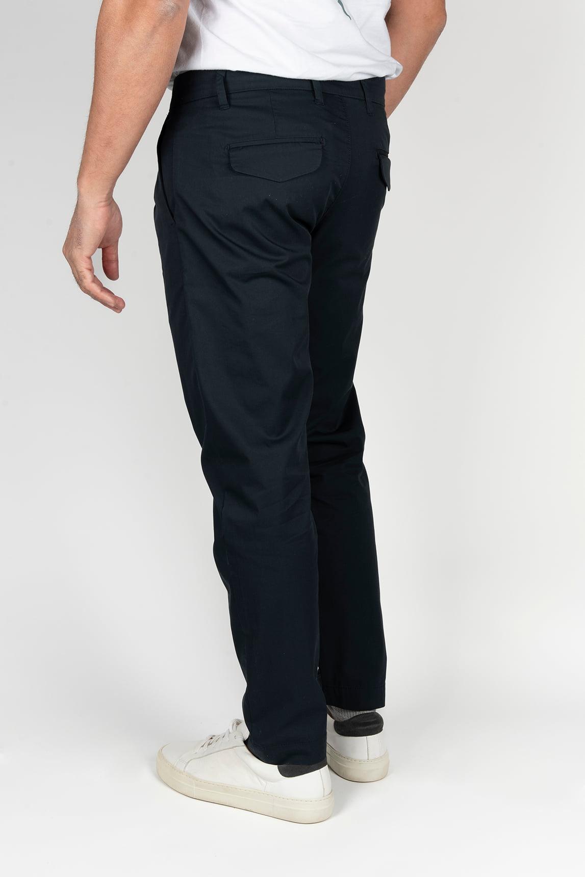 Su tono azul marino aporta un aire sofisticado y fácil de combinar con diferentes prendas del armario masculino. El diseño con pinzas en la parte frontal mejora la caída del pantalón y añade un toque refinado, mientras que los bolsillos laterales y los bolsillos traseros con solapa refuerzan su funcionalidad y equilibrio estético.