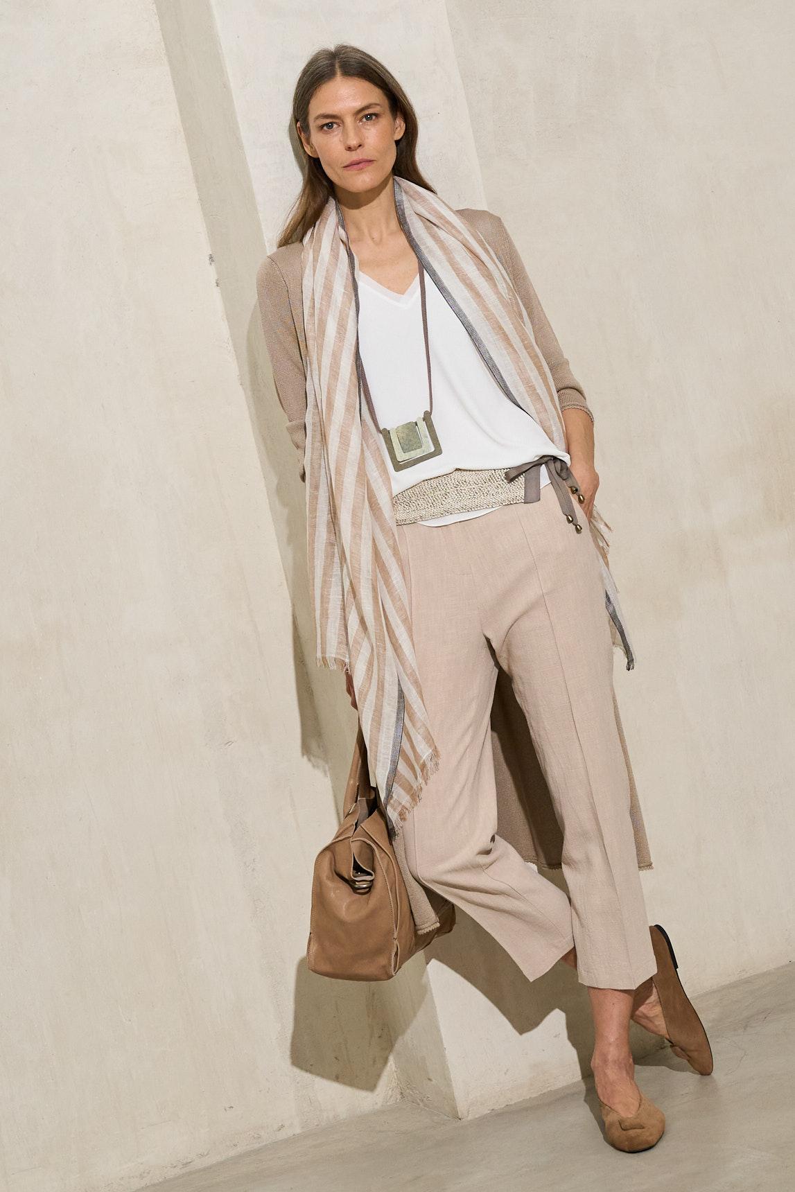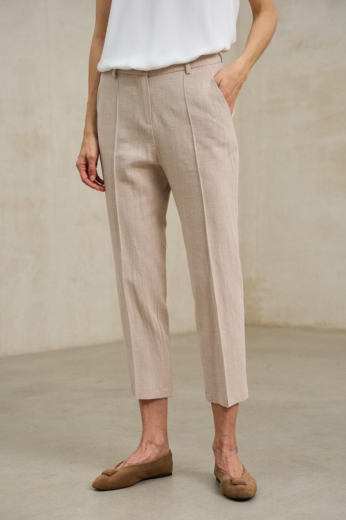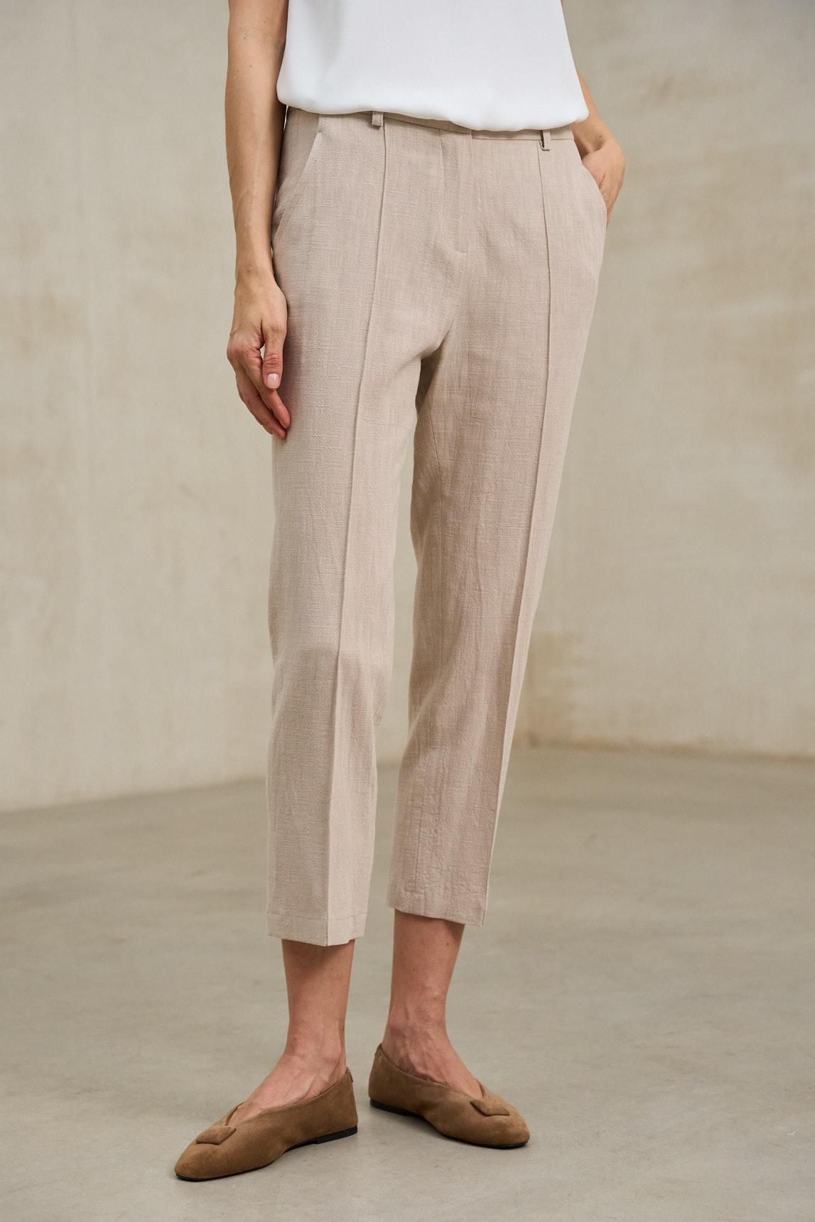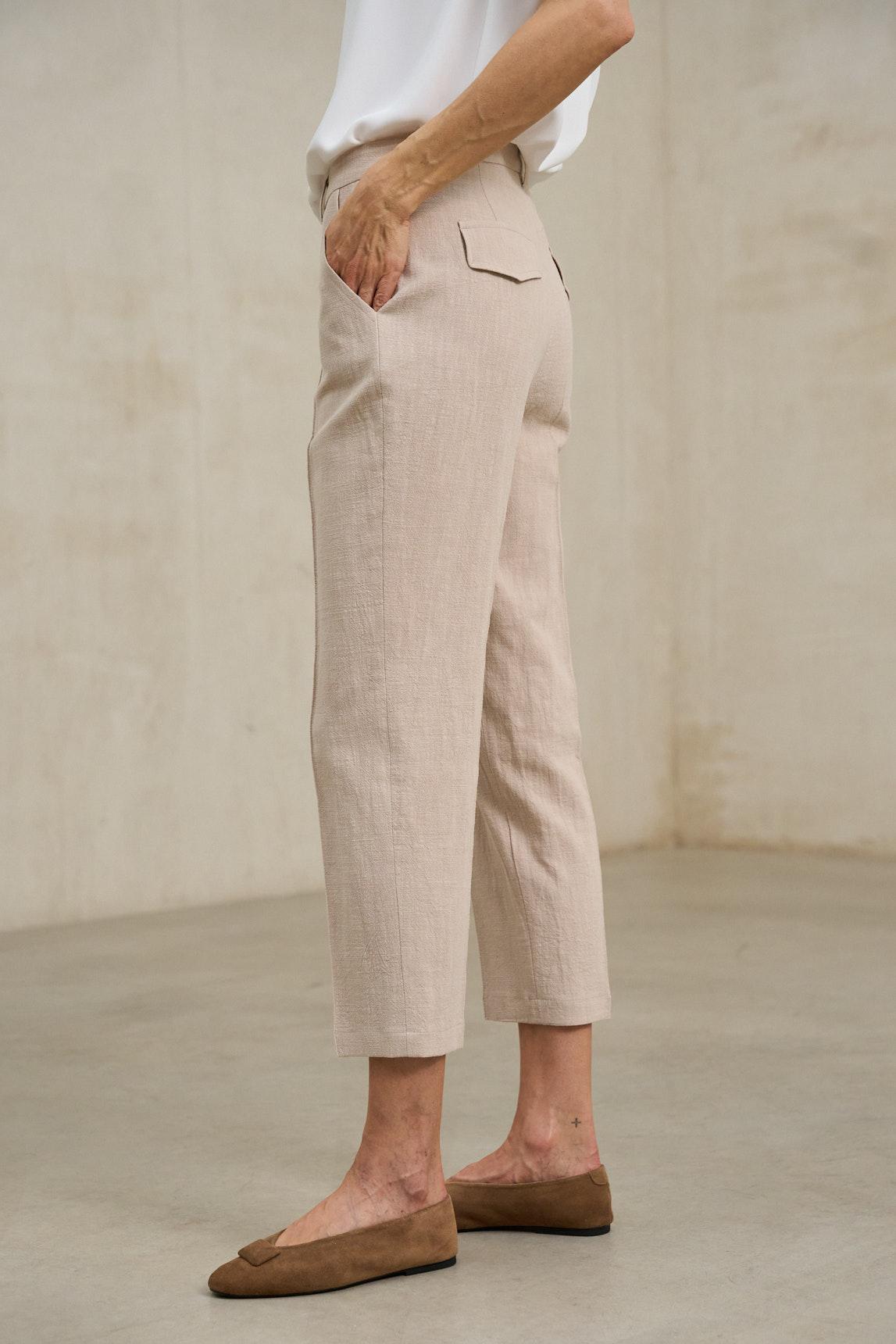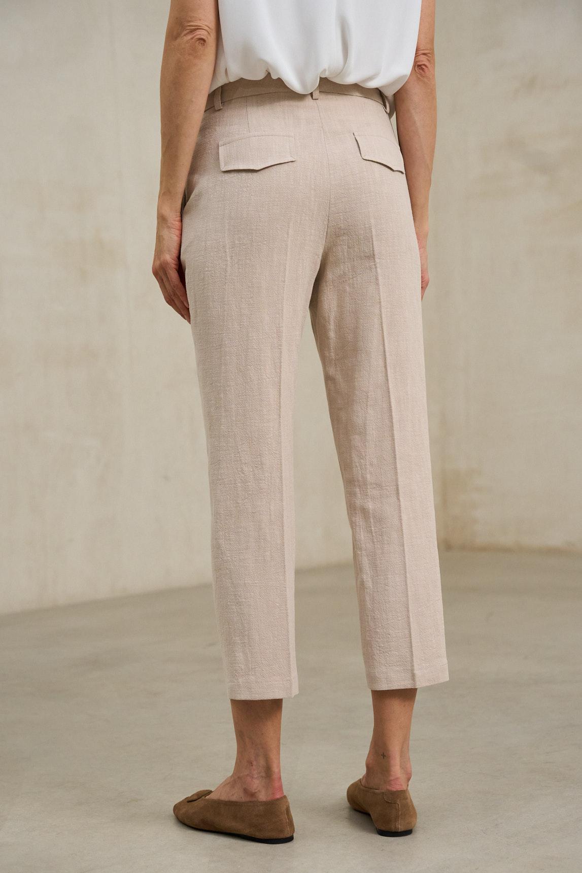 De líneas depuradas y aire sastre, este pantalón presenta cintura estructurada con trabillas, cierre frontal con botón y una abertura discreta que mantiene el delantero limpio. Las pinzas frontales aportan forma y caída, mientras los bolsillos laterales en diagonal suman funcionalidad sin romper la silueta. La pernera se estrecha suavemente hacia el bajo, con un largo tobiller o que estiliza y deja el look ligero.