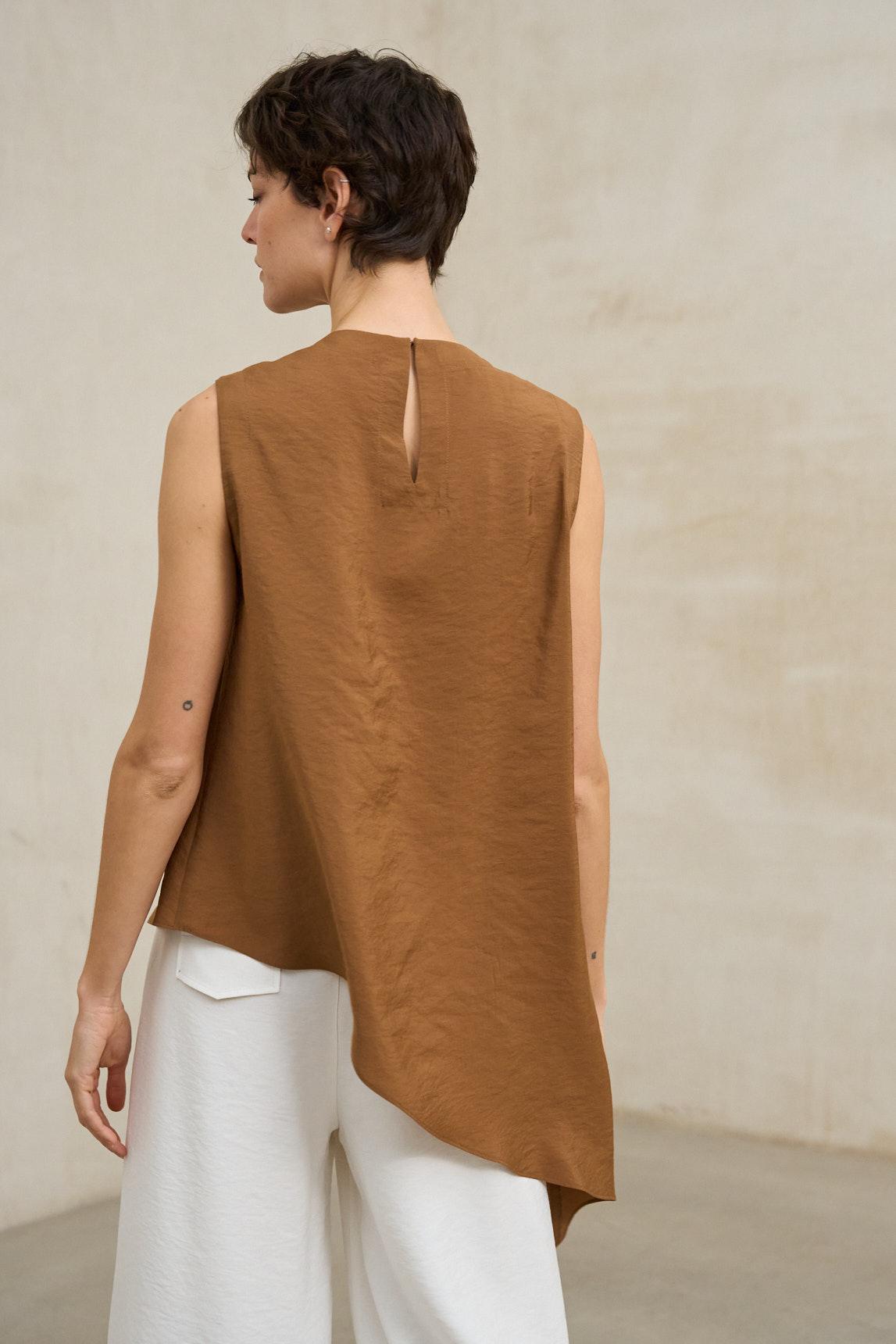 El top Aristea cobre es una prenda de líneas contemporáneas que destaca por su diseño asimétrico y su silueta fluida. Su escote cerrado y su bajo en pico lateral aportan dinamismo al conjunto, creando un efecto estilizado y moderno.
