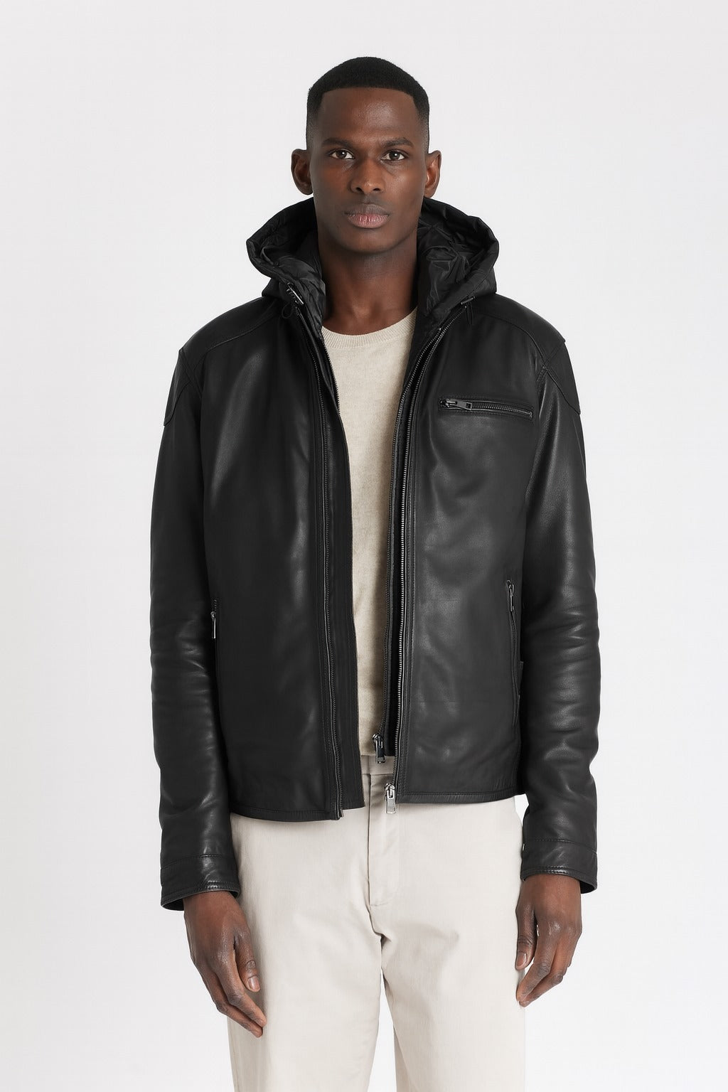 La Chic Hood de Serge Pariente tiene un enfoque urbano y funcional: una chaqueta de cuero con capucha y líneas limpias que eleva cualquier look casual, ya sea con camiseta, sudadera o camisa.