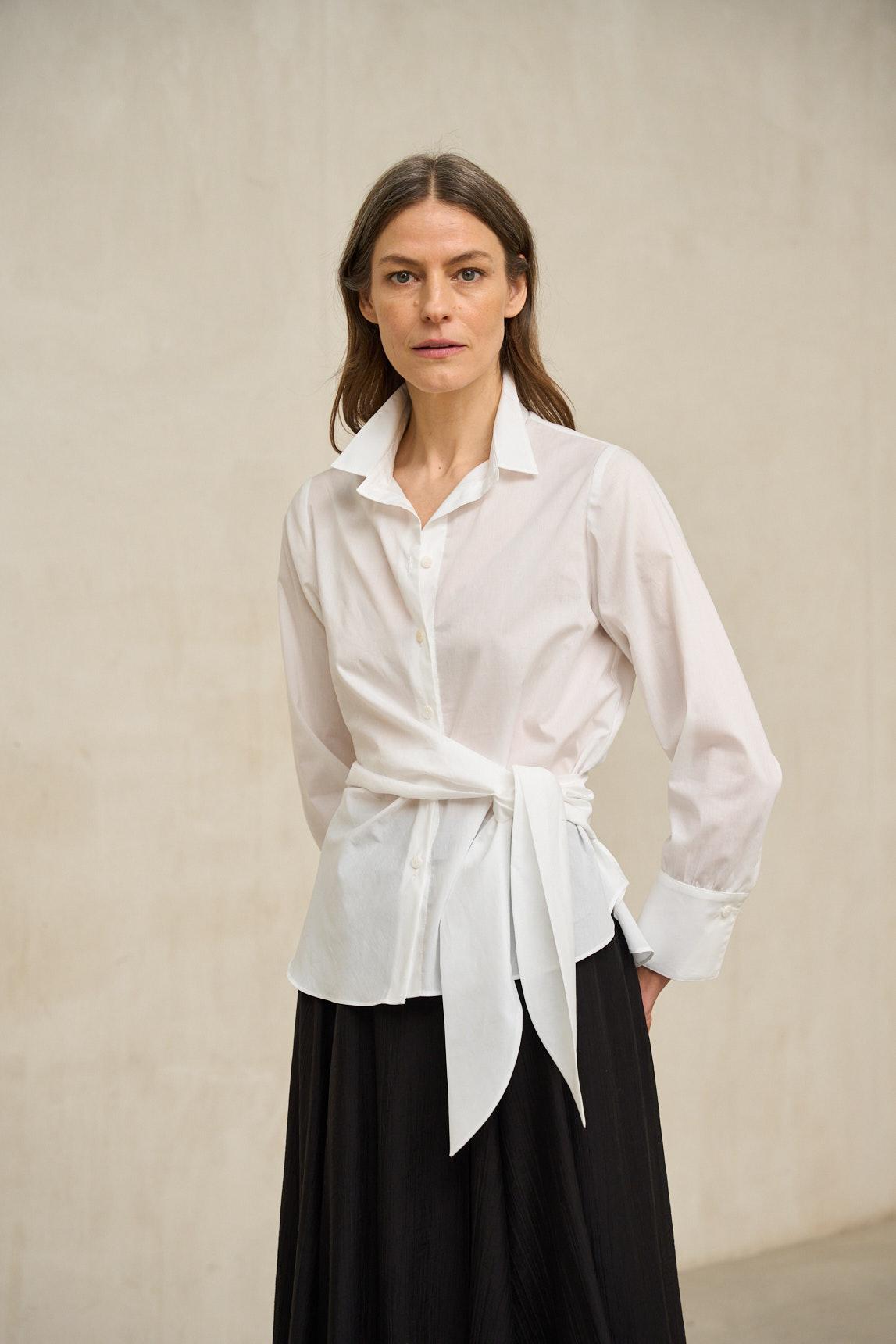 La Camisa Vaelia blanco roto destaca por su diseño cruzado con lazada lateral que aporta movimiento y un aire contemporáneo a la silueta clásica. Confeccionada en tejido ligero y de caída suave, presenta cuello camisero y manga larga con puño, equilibrando estructura y fluidez.