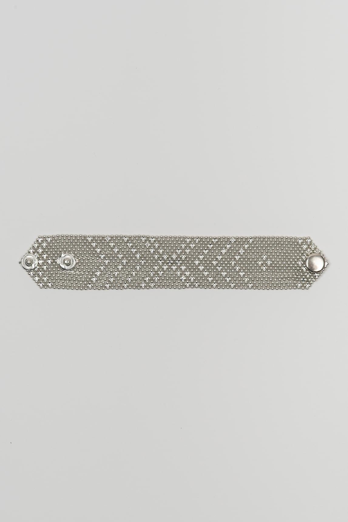 Brazalete de mujer en acabado plata con diseño ancho y superficie calada de inspiración geométrica. La pieza presenta una estructura plana y alargada que envuelve la muñeca con una presencia ligera pero muy visual, mientras el trabajo perforado aporta textura, profundidad y un brillo frío de efecto refinado. Su línea limpia y decorativa equilibra modernidad y elegancia con mucha naturalidad.