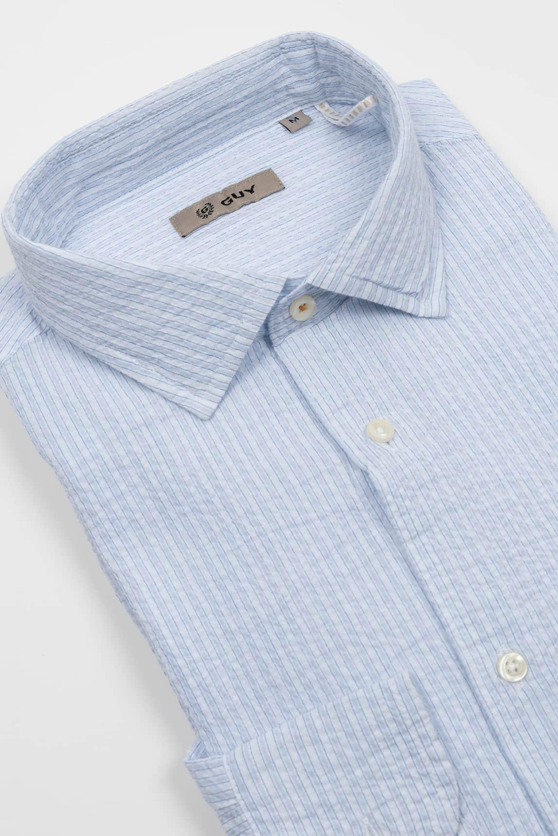 Camisa de manga larga con silueta recta y diseño de raya vertical fina en tono azul cielo sobre fondo claro. Presenta cuello clásico, cierre frontal de botones vistos y puño abotonado, con una superficie de textura visual suave que aporta naturalidad y un acabado ligero. La línea del dibujo vertical estiliza el conjunto y refuerza una imagen limpia, luminosa y muy fácil de combinar.