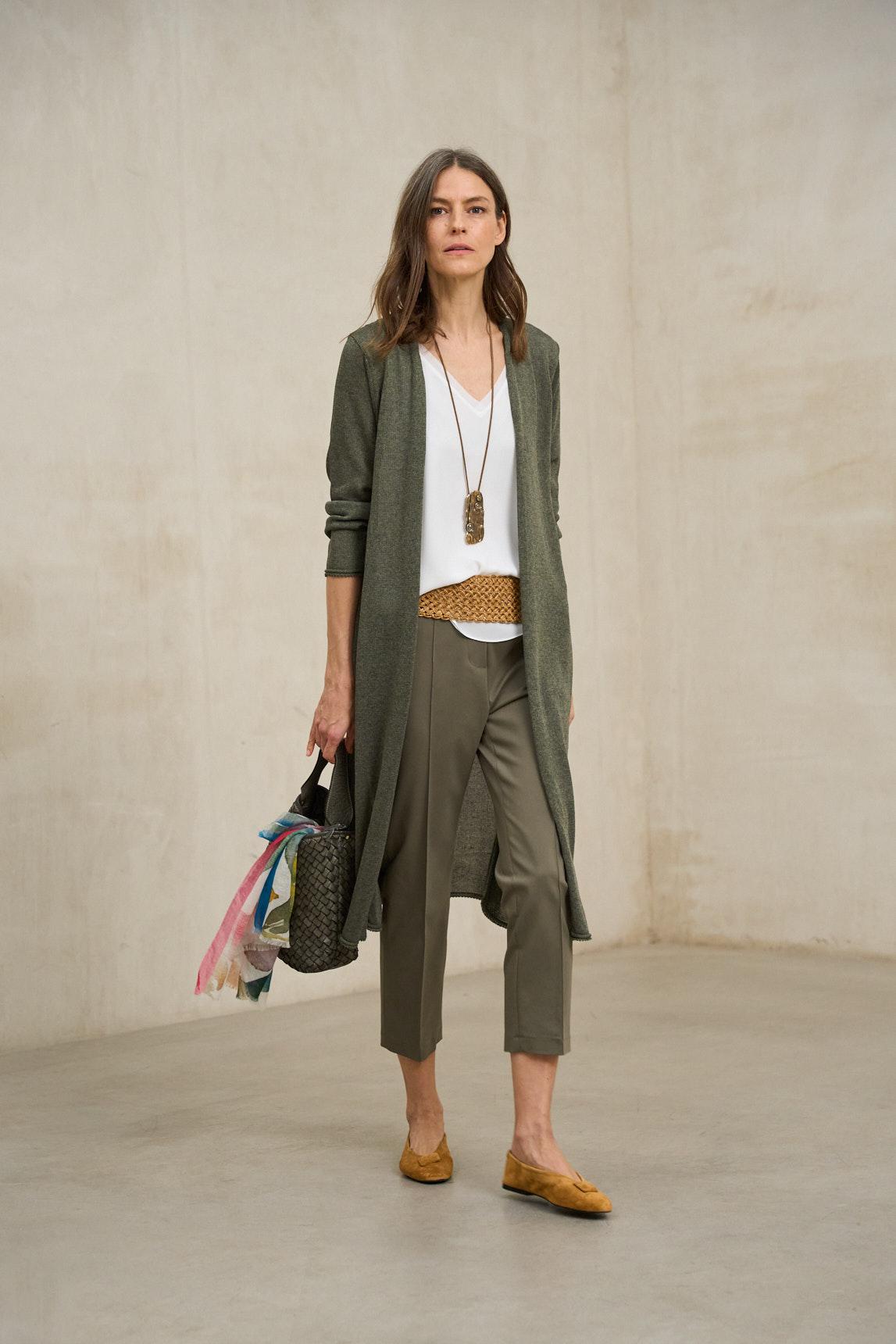 La chaqueta de punto Avelin verde oliva es una prenda larga y fluida diseñada para aportar movimiento y sofisticación a los looks de entretiempo. Su diseño abierto, sin cierre, cae con naturalidad desde los hombros, creando una silueta estilizada que alarga visualmente la figura.