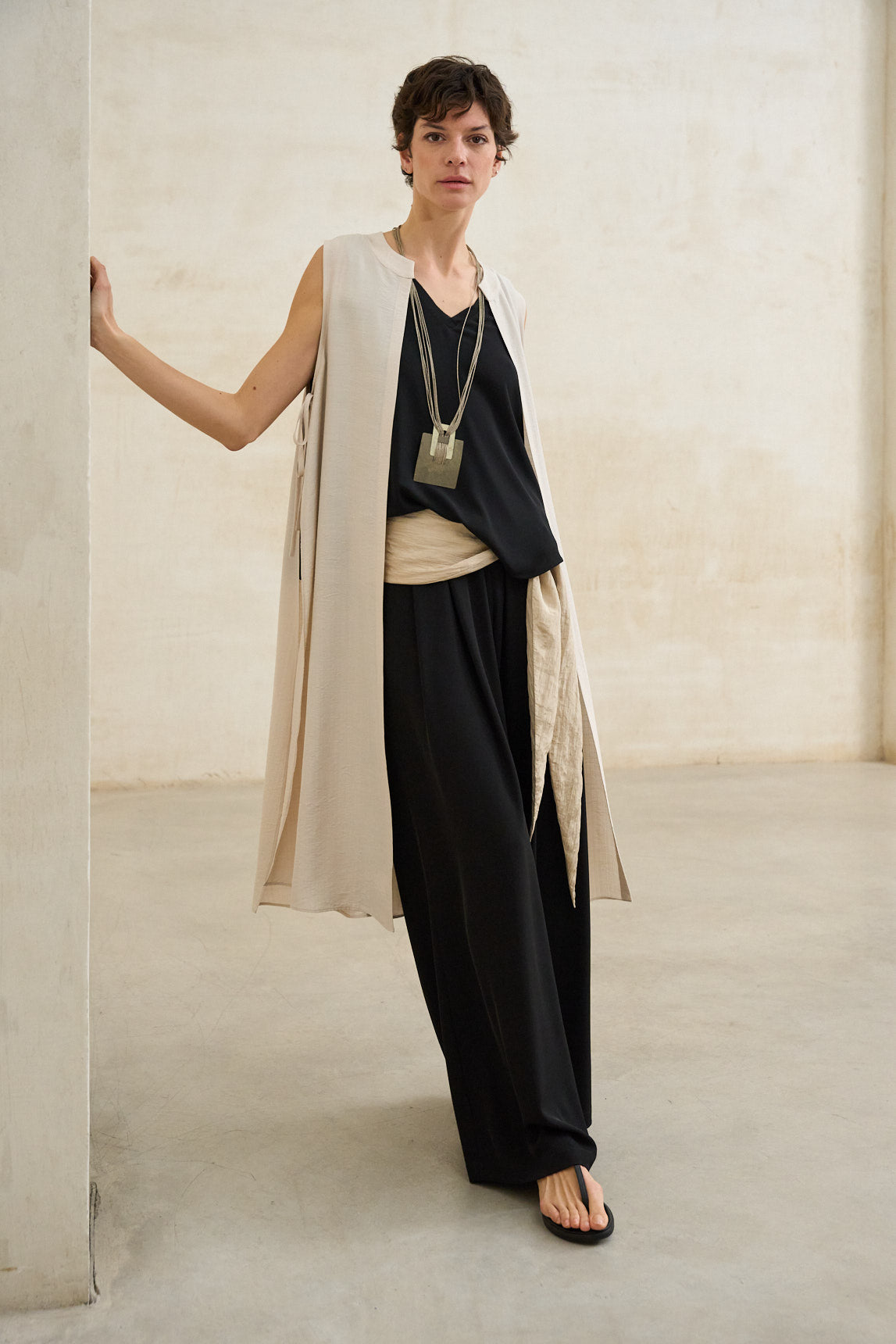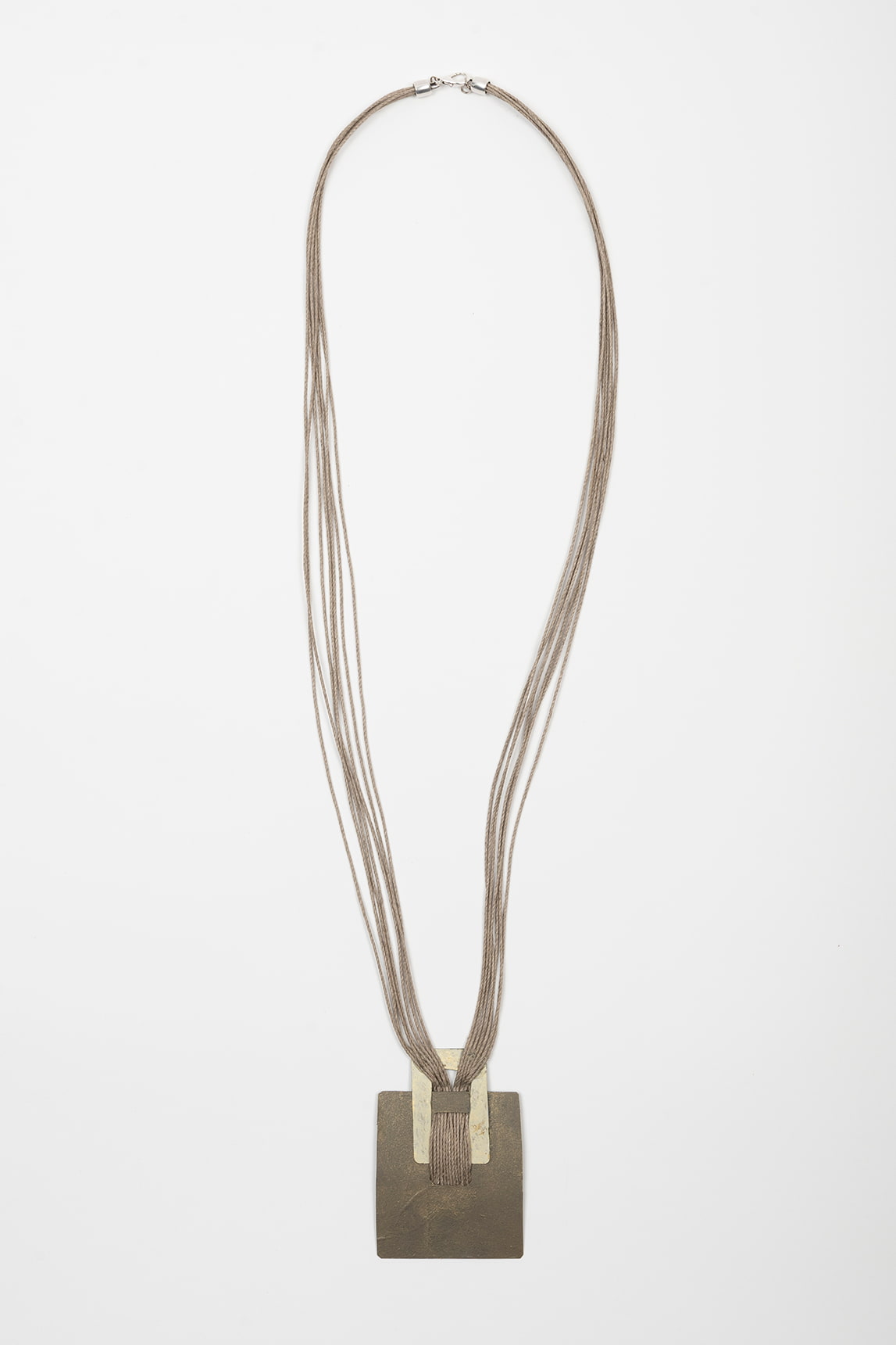 Collar largo de varias hebras finas en tono plata envejecida, con caída limpia y un colgante geométrico protagonista. Las cadenas se agrupan hacia el centro y sostienen una placa cuadrada de acabado metalizado mate, de la que descienden dos tiras estrechas que aportan verticalidad y un movimiento sutil al caminar. El conjunto se cierra con broche metálico discreto, pensado para mantener la línea minimal y dejar todo el peso visual en la pieza central.