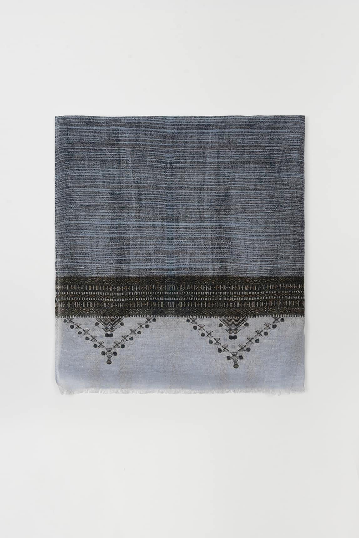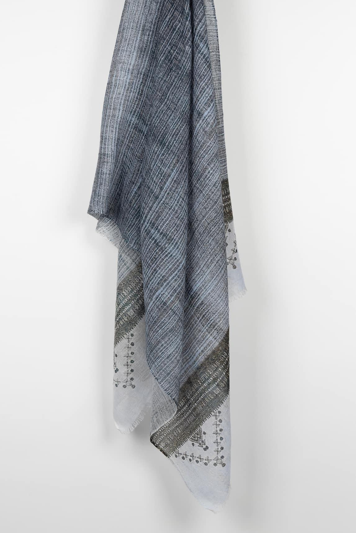 El Fular Eryon azul grisáceo destaca por su diseño geométrico sutil en una paleta fría y elegante. La superposición de líneas y tramas crea un efecto visual delicado que aporta profundidad sin resultar recargado.