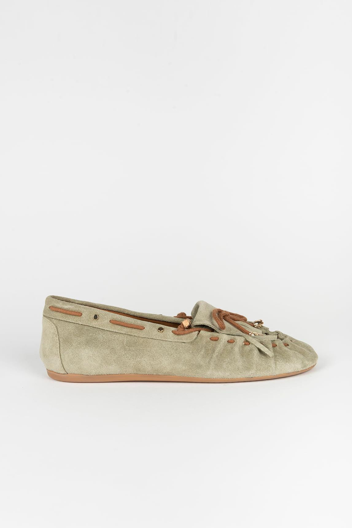 El mocasín Flecco pistacho reinterpreta el clásico mocasín con un diseño relajado y lleno de personalidad. Destaca por su detalle de flecos en el empeine y el lazo decorativo con terminaciones metálicas, elementos que aportan movimiento y un toque artesanal al conjunto.