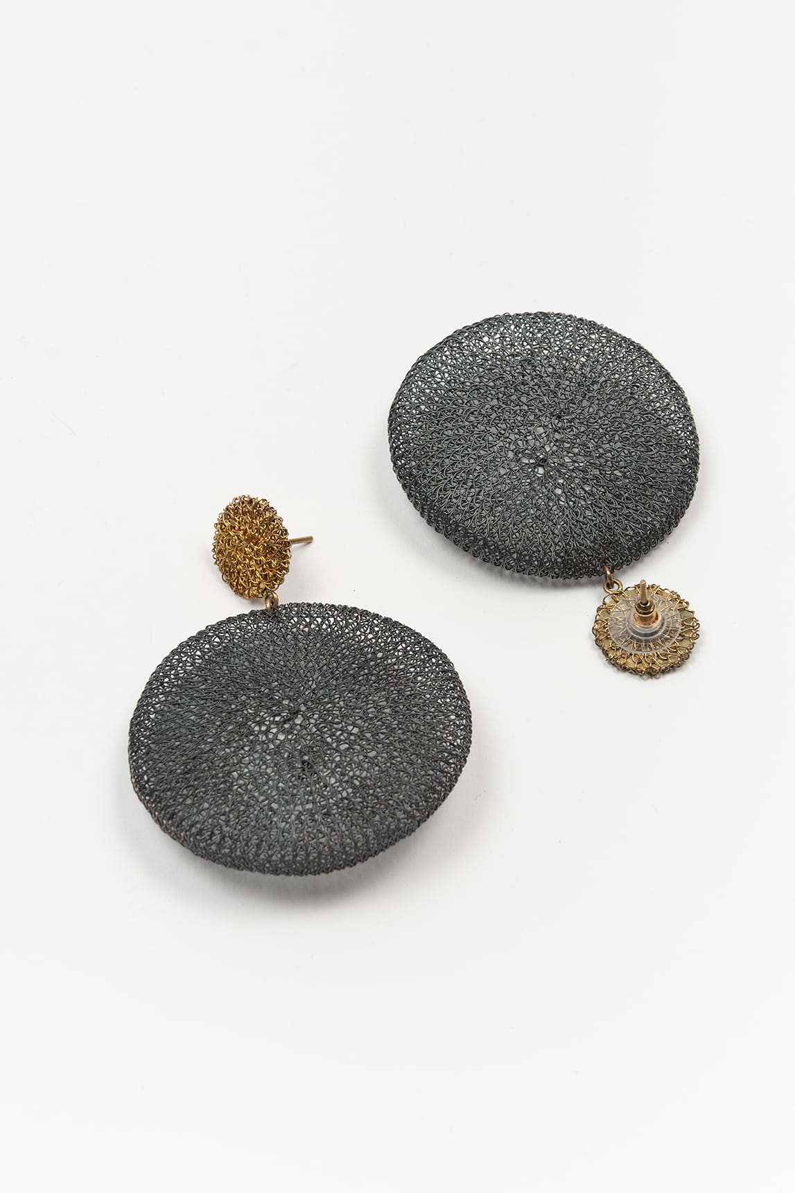 - Pendientes circulares elaborados en malla metálica con efecto bronce envejecido.