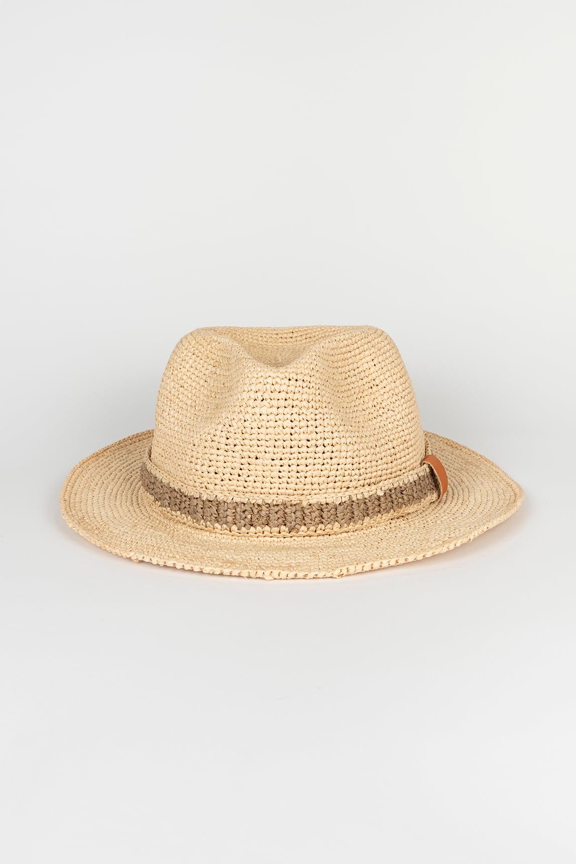 Sombrero de mujer en color natural con copa de líneas suaves, ala media y diseño calado de efecto artesanal. La estructura presenta un trenzado abierto que aligera visualmente la pieza y aporta un aire fresco y luminoso, mientras la cinta decorativa al tono con detalle trenzado refuerza su estética serena y equilibrada. Su silueta recuerda al sombrero fedora reinterpretado en una versión más ligera y relajada.