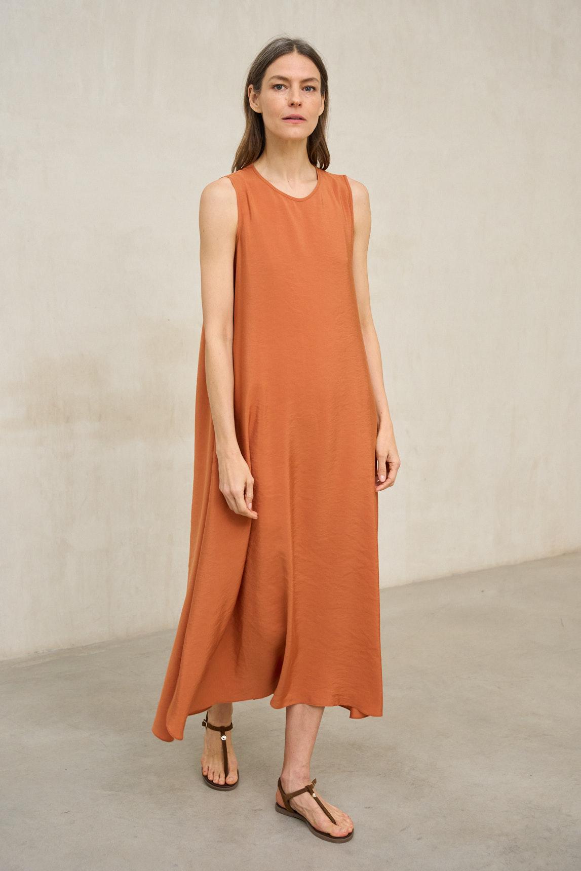 El vestido Elara coral es una prenda fluida de líneas limpias que destaca por su silueta amplia y su movimiento natural. Su diseño sin mangas y escote redondo mantiene una estética depurada y atemporal, mientras que el corte evasé aporta ligereza y caída envolvente al caminar. El tono coral, cálido y luminoso, realza el bronceado y aporta energía al look sin perder elegancia. Su estructura amplia y tejido ligero lo convierten en una opción ideal para los meses más cálidos, ofreciendo comodidad y sofisticación en una sola pieza. Gracias a su patrón amplio, es un vestido versátil que puede llevarse tanto en clave relajada con sandalias planas como en propuestas más elevadas con cuñas o accesorios protagonistas. Nos esforzamos por mostrar los colores de la forma más fiel posible, pero pueden variar ligeramente respecto a la realidad.