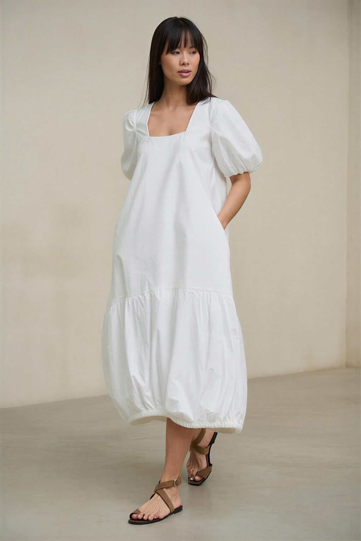 Vestido de mujer en color blanco con escote cuadrado, manga corta amplia y silueta de volumen suave. El diseño se construye con una línea limpia y amplia que cae con ligereza y termina en un bajo globo con elástico, aportando movimiento, forma y una presencia visual muy actual. Los bolsillos laterales integrados suman funcionalidad al conjunto sin romper la estética depurada, mientras el acabado liso refuerza su carácter luminoso y sofisticado.