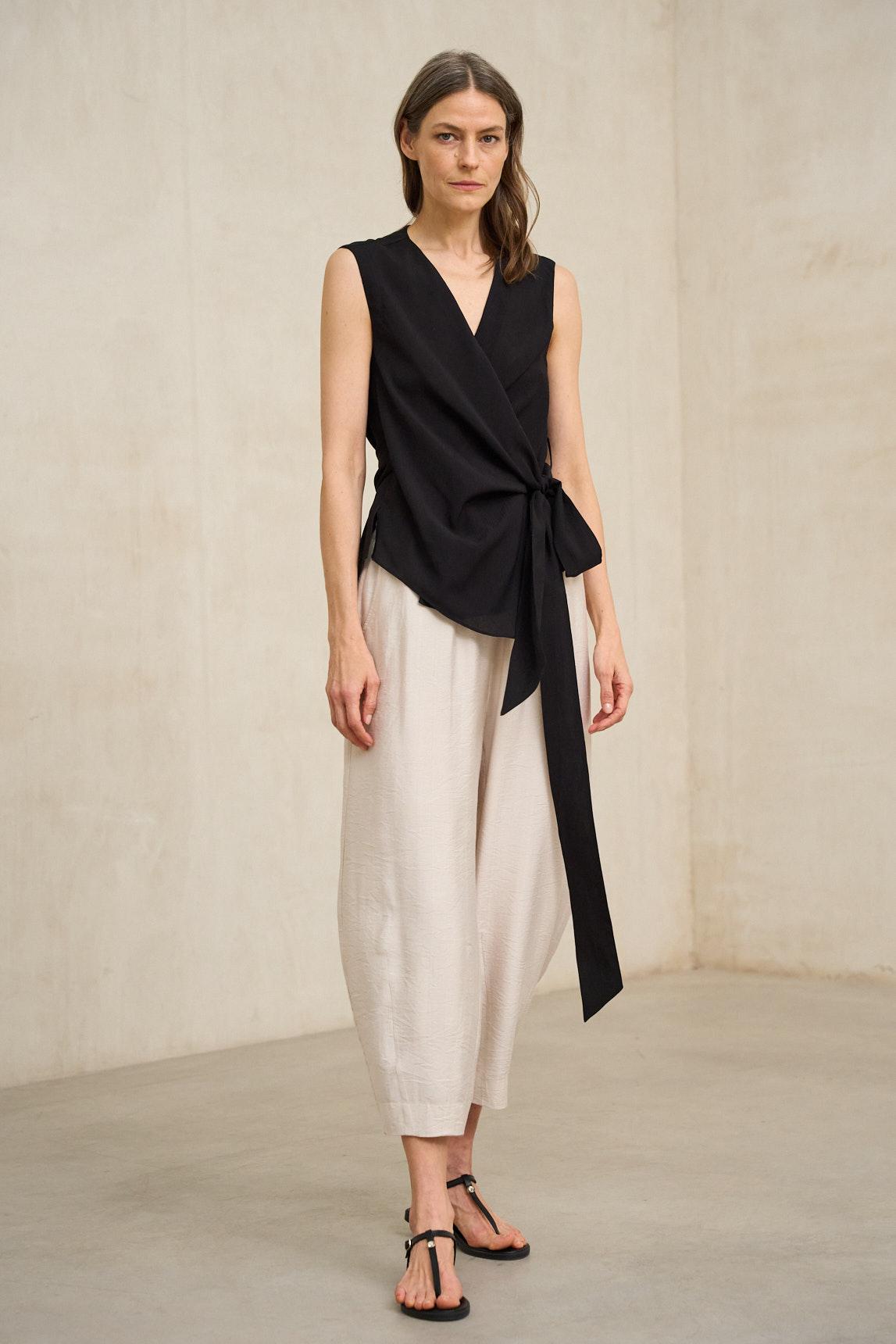 The lightweight fabric allows for movement without stiffness, creating an elegant drape that works for both daytime looks and more formal occasions. The black color reinforces its timeless character and allows it to be paired with wide-leg trousers, midi skirts, or minimalist monochromatic outfits.