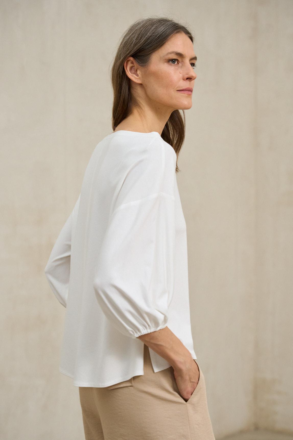 Women's T-shirt made from lightweight knit fabric with a soft feel and natural drape. Boat neckline, long sleeves with elasticated cuffs and a fluid silhouette that gives a relaxed and feminine look.
