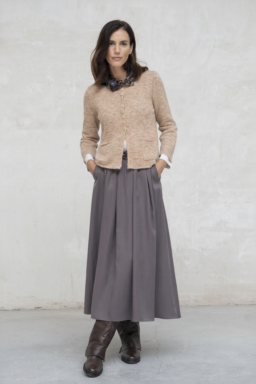 El cárdigan Sofi en camel jaspeado es una prenda imprescindible para sumar suavidad y estilo al armario. Su tejido de punto aporta textura, mientras que los botones a juego y los bolsillos delanteros lo convierten en un diseño cómodo y fácil de llevar. Perfecto para combinar con básicos diarios o para añadir una capa elegante en looks de entretiempo.