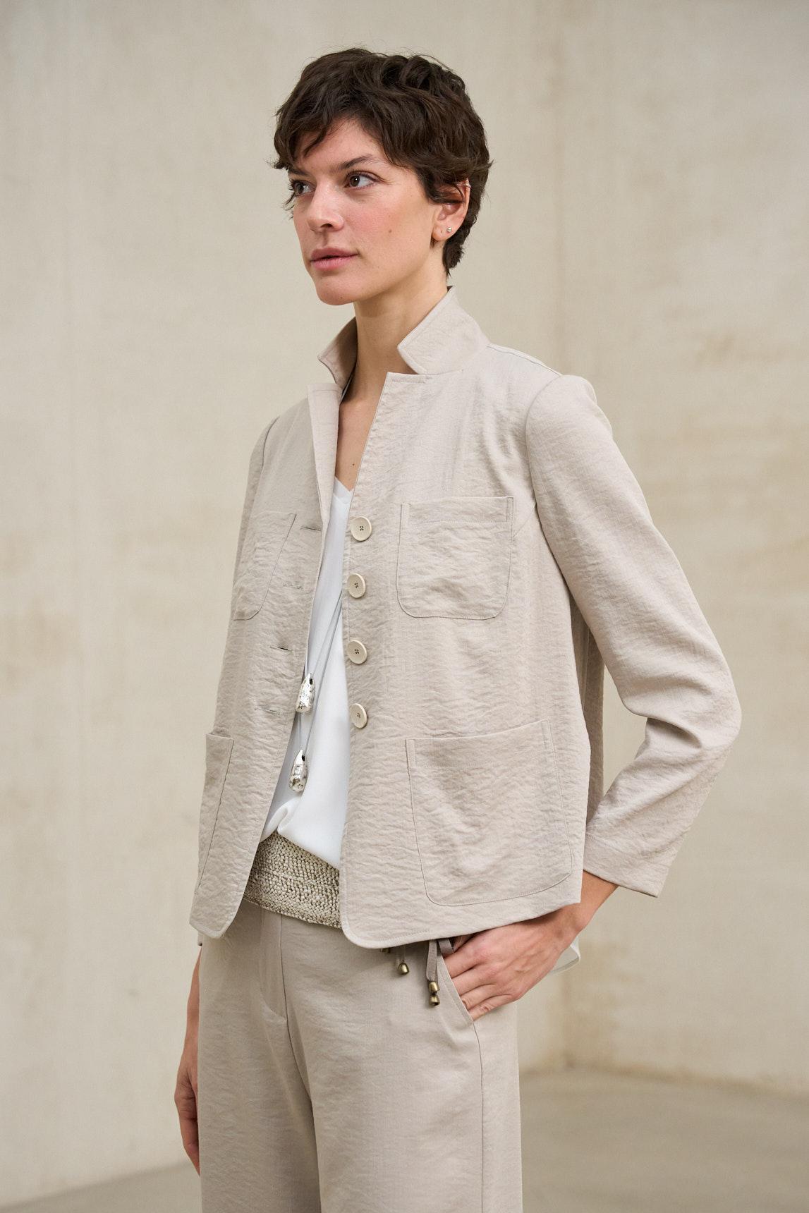 Women's jacket made from a naturally crinkled fabric. It features a lapel collar, a button-front closure in matching colors, and two large patch pockets that add functionality to the design. It has long sleeves and a slightly straight hem, with a soft structure that combines comfort and lightness.