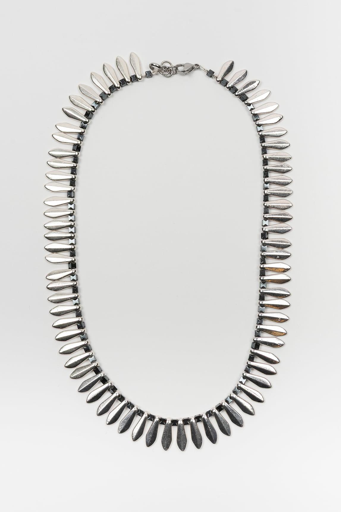 The Aurelis silver necklace stands out for its structured and contemporary design, composed of a continuous succession of elongated pieces that create a rhythmic and enveloping effect around the neckline. Its defined silhouette adds character without sacrificing elegance. The silver finish enhances its modern and luminous aesthetic, reflecting light in a subtle and sophisticated way. It's ideal for pairing with black, gray, navy, or monochromatic outfits where a statement accessory with balance is desired. Its articulated design allows it to fit comfortably around the neck, creating a dynamic visual effect that elevates any look with a modern and refined air. We strive to display colors as accurately as possible, but they may vary slightly from reality.