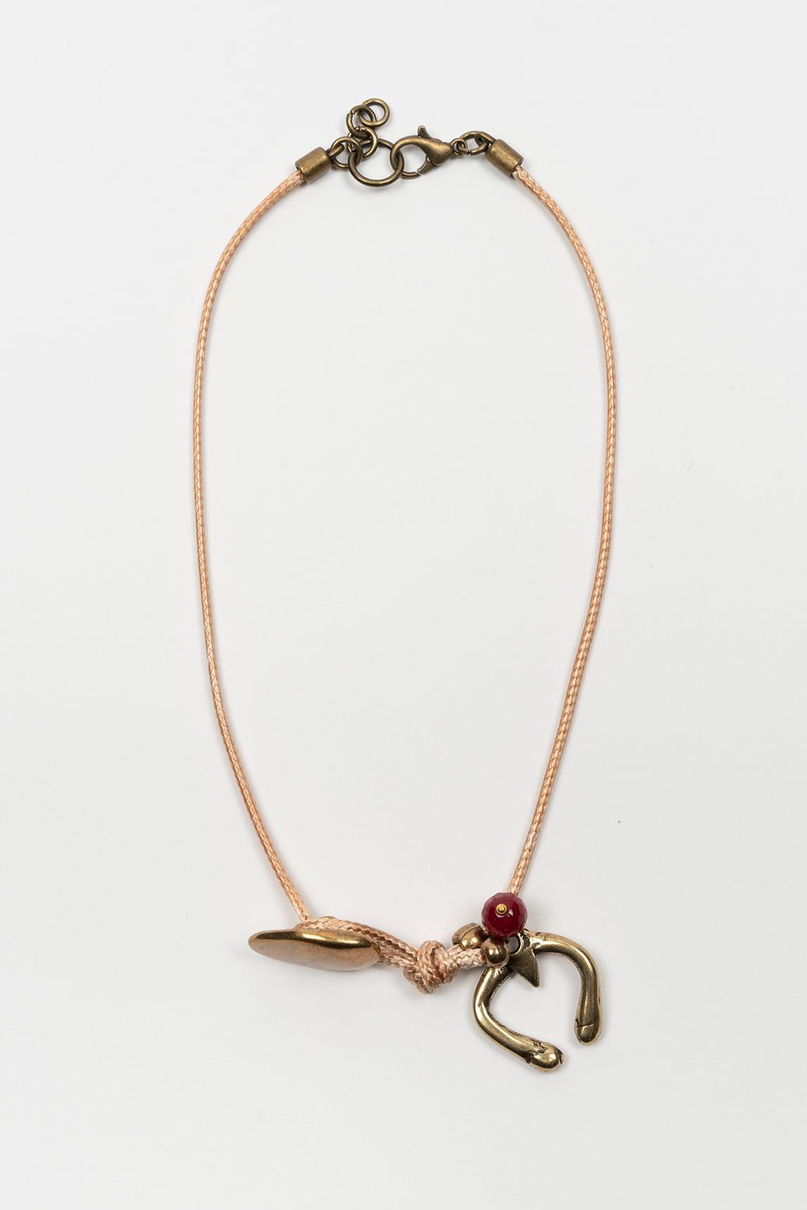 The Nerelia choker in a brass finish combines delicacy and character in a slender design that includes two zamak pieces—a button and a horseshoe, both brass-plated—along with an agate stone. Its lightweight structure supports a balanced composition of elements that provide movement and personality.
