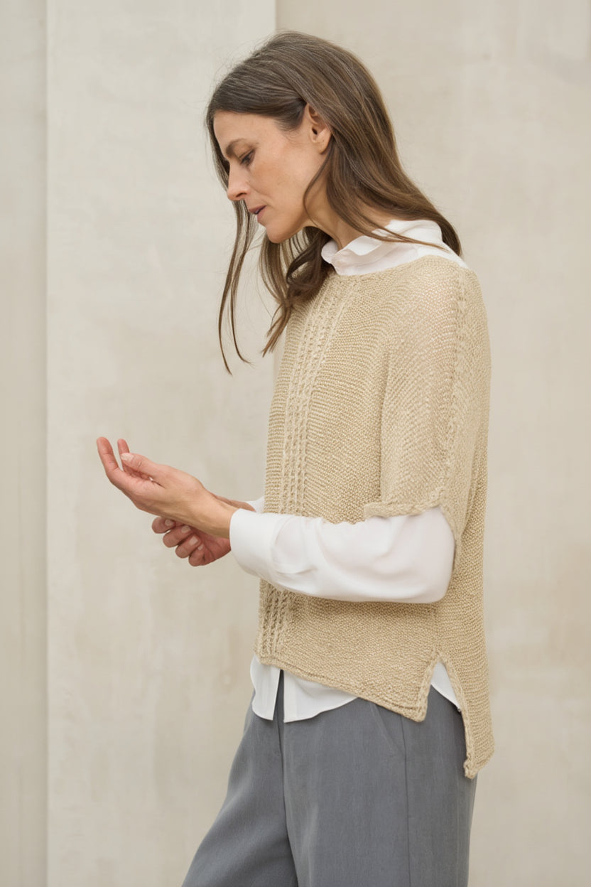 The beige tone enhances its luminosity and makes it a sophisticated basic in a neutral wardrobe. It pairs especially well with sand, beige, taupe, or olive green trousers. As it is a lightweight knit fabric, we recommend wearing it with a basic top underneath (not included) for a more harmonious finish.