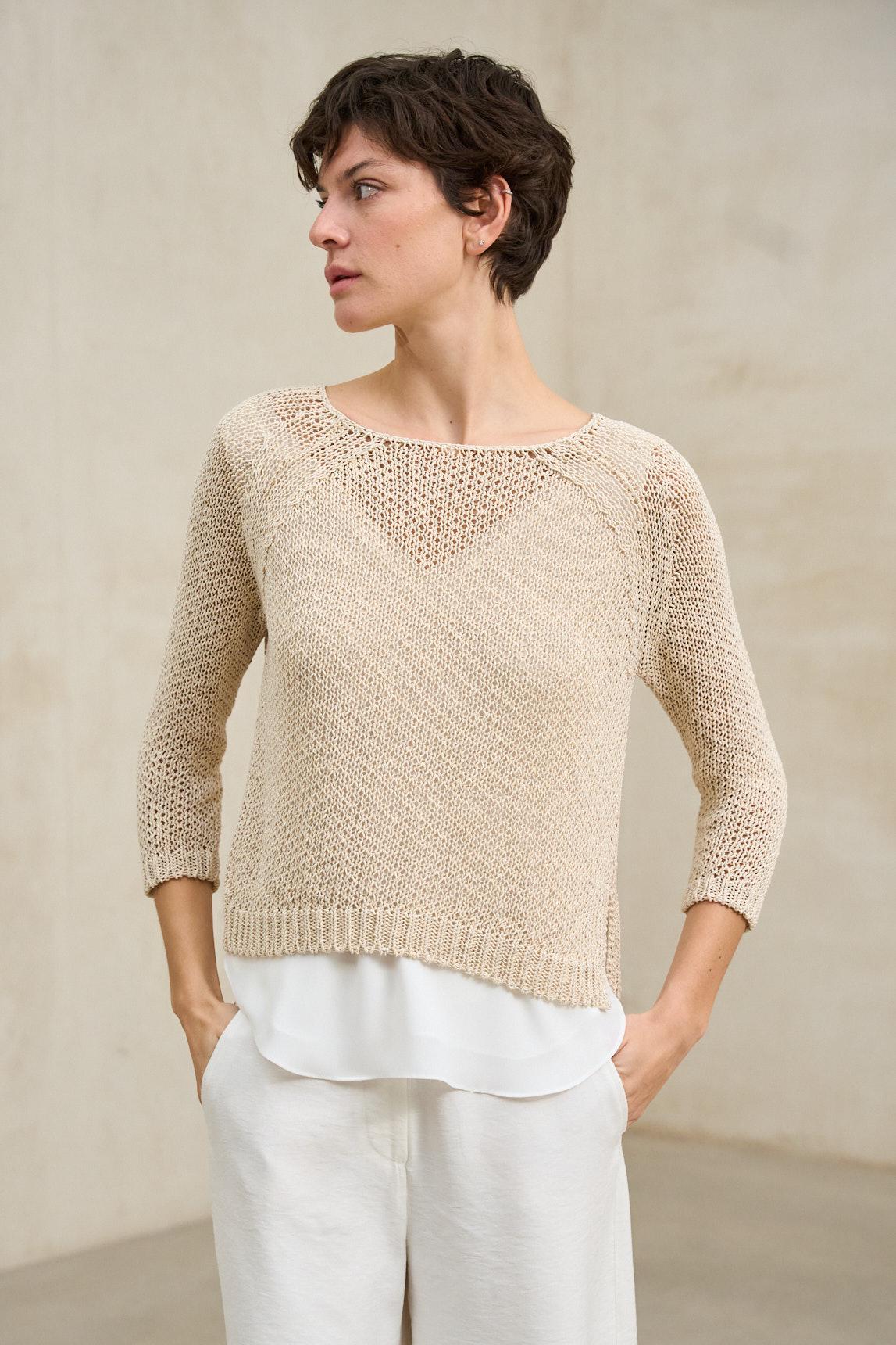 The Évela sand beige sweater combines the lightness of fine knit fabric with delicate openwork detailing on the upper part, adding texture and visual depth. Its subtly translucent fabric creates a light and ethereal effect; it's recommended to wear it with a top underneath (not included), such as the off-white Alenia top, for a natural and balanced finish. It features a wide neckline and three-quarter sleeves, with a soft structure that moves with you without being restrictive. Its relaxed silhouette makes it an ideal piece for layering and creating neutral-inspired outfits. The sandy beige tone conveys warmth and harmony, pairing especially well with flowing trousers in ecru, olive green, or earth tones. A versatile garment designed for a serene and sophisticated wardrobe. We strive to display colors as accurately as possible, but they may vary slightly from reality.
