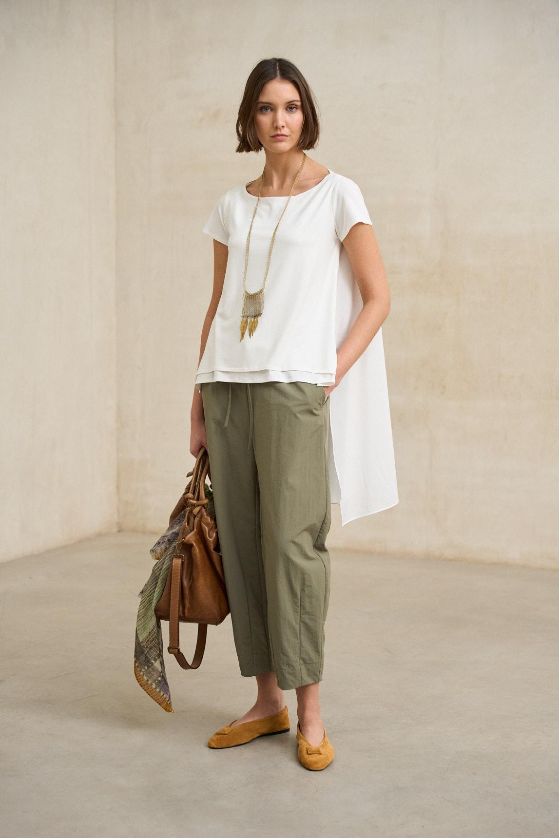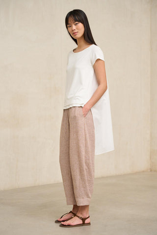 Con cintura elástica fruncida, este pantalón cae con una silueta relajada que se define por sus pinzas frontales y un largo tobillero ligeramente estrechado en el bajo. La superficie se percibe suave y con una leve textura que aporta profundidad al color, mientras el tiro cómodo acompaña el movimiento sin marcar.