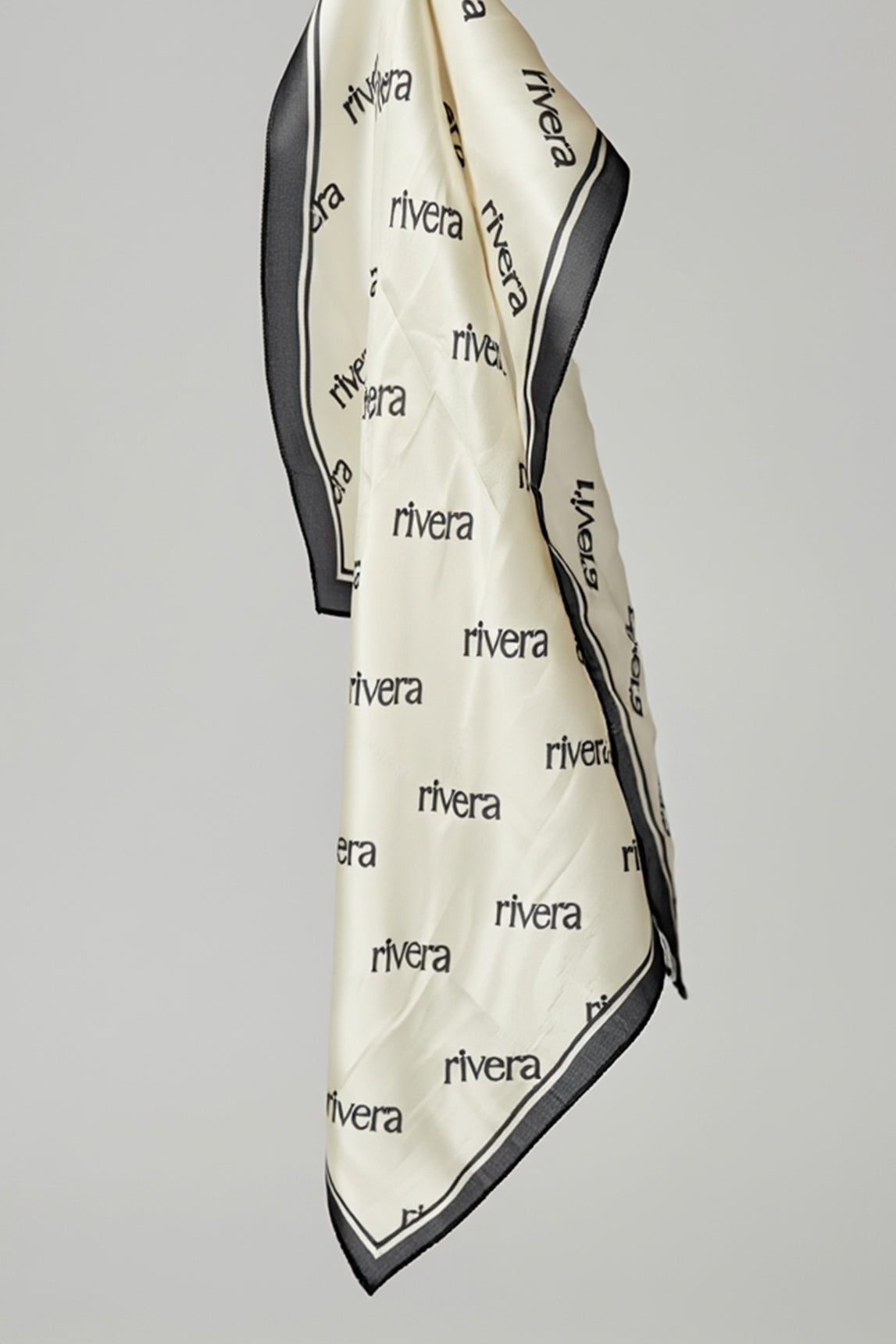 Este pañuelo de seda de Rivera aporta un toque sofisticado y atemporal a cualquier conjunto. Su diseño con logo Rivera refuerza la identidad de la marca, mientras que la combinación de tonos neutros lo convierte en un accesorio versátil. Ideal para llevar al cuello, anudado al bolso o como detalle distintivo en looks formales y casuales.