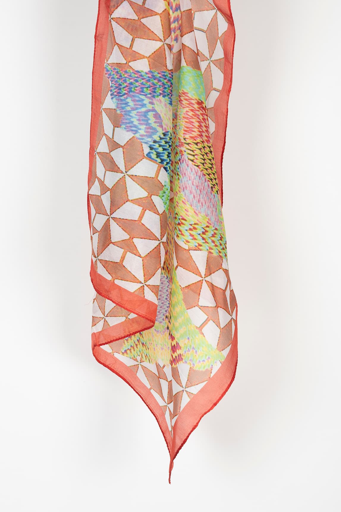 A light and airy scarf with a light base and a warm-toned geometric mosaic pattern. A vibrant, multicolored detail in the center adds an artistic and contemporary touch. It is finished with a coral border that frames the piece and enhances its overall look, with a fluid drape ideal for tying without adding bulk.