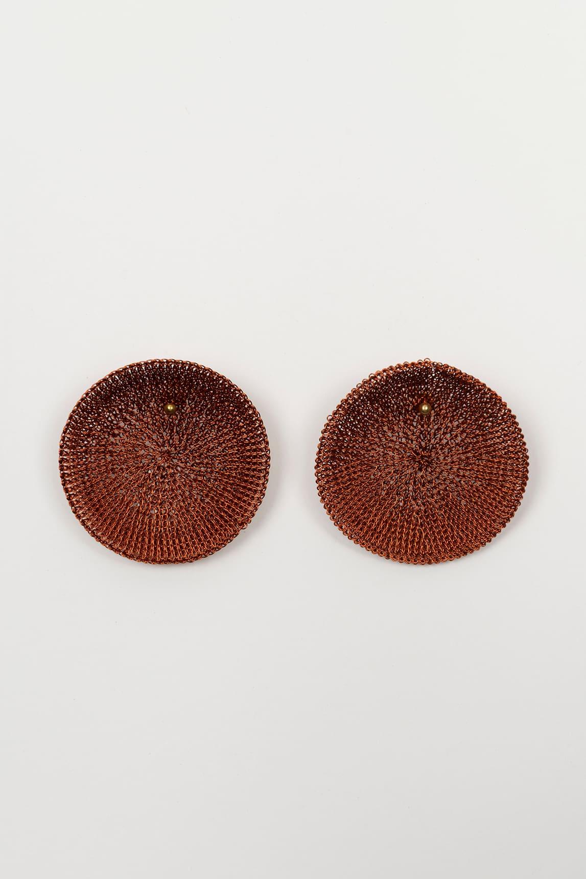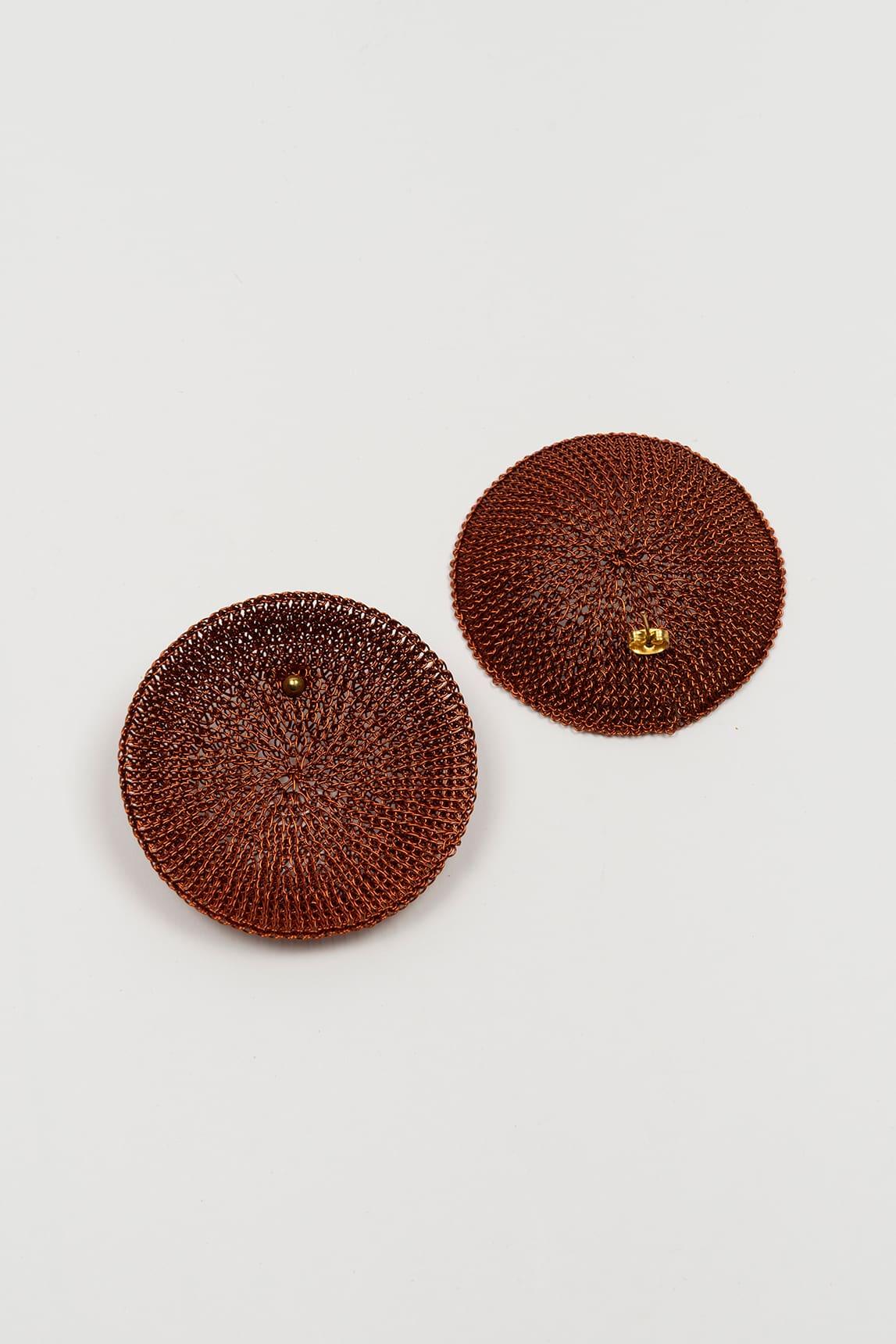 Pendientes de mujer en tono teja con diseño circular de malla metálica. La superficie presenta un entramado fino que genera una textura rica y continua, aportando profundidad y un acabado visual con carácter. Su forma plana y redonda construye una silueta equilibrada y actual, con un punto central que refuerza su estética limpia.
