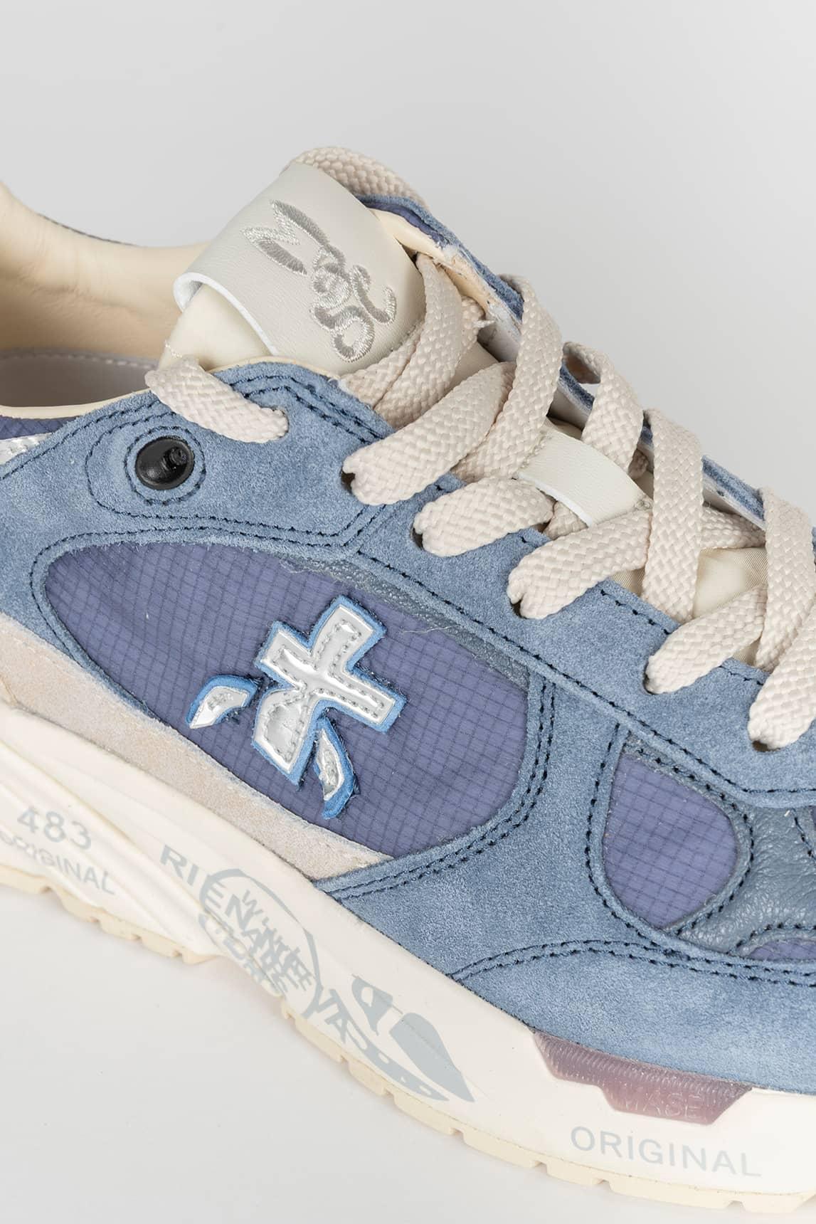 Zapatillas de hombre Premiata Mased 8113 en color azul, con diseño de inspiración running y silueta baja de líneas deportivas. El modelo combina paneles en distintas tonalidades de azul con acabados lisos, zonas de textura visual más suave y cordonera al tono, creando una imagen dinámica y muy actual. El detalle lateral refuerza la identidad visual de la pieza, mientras la suela de volumen medio con gráfica visible aporta carácter, contraste y una pisada visualmente más sólida.