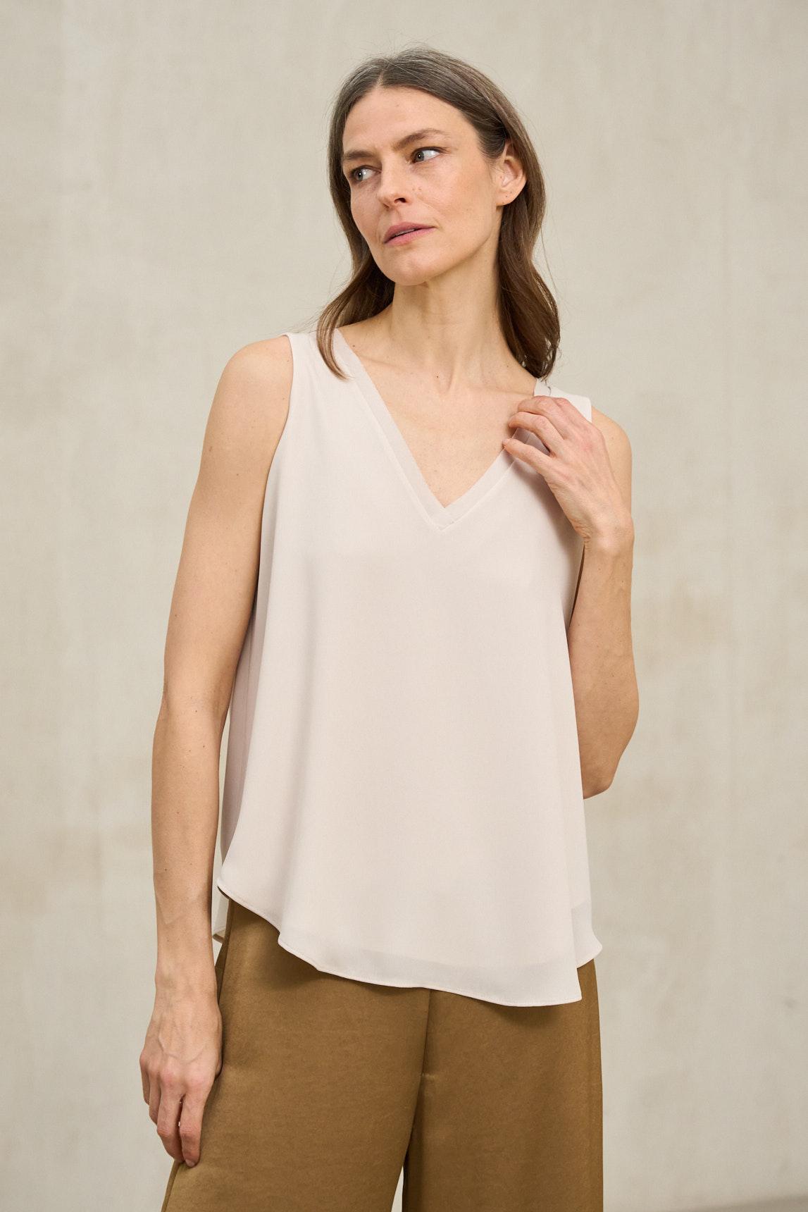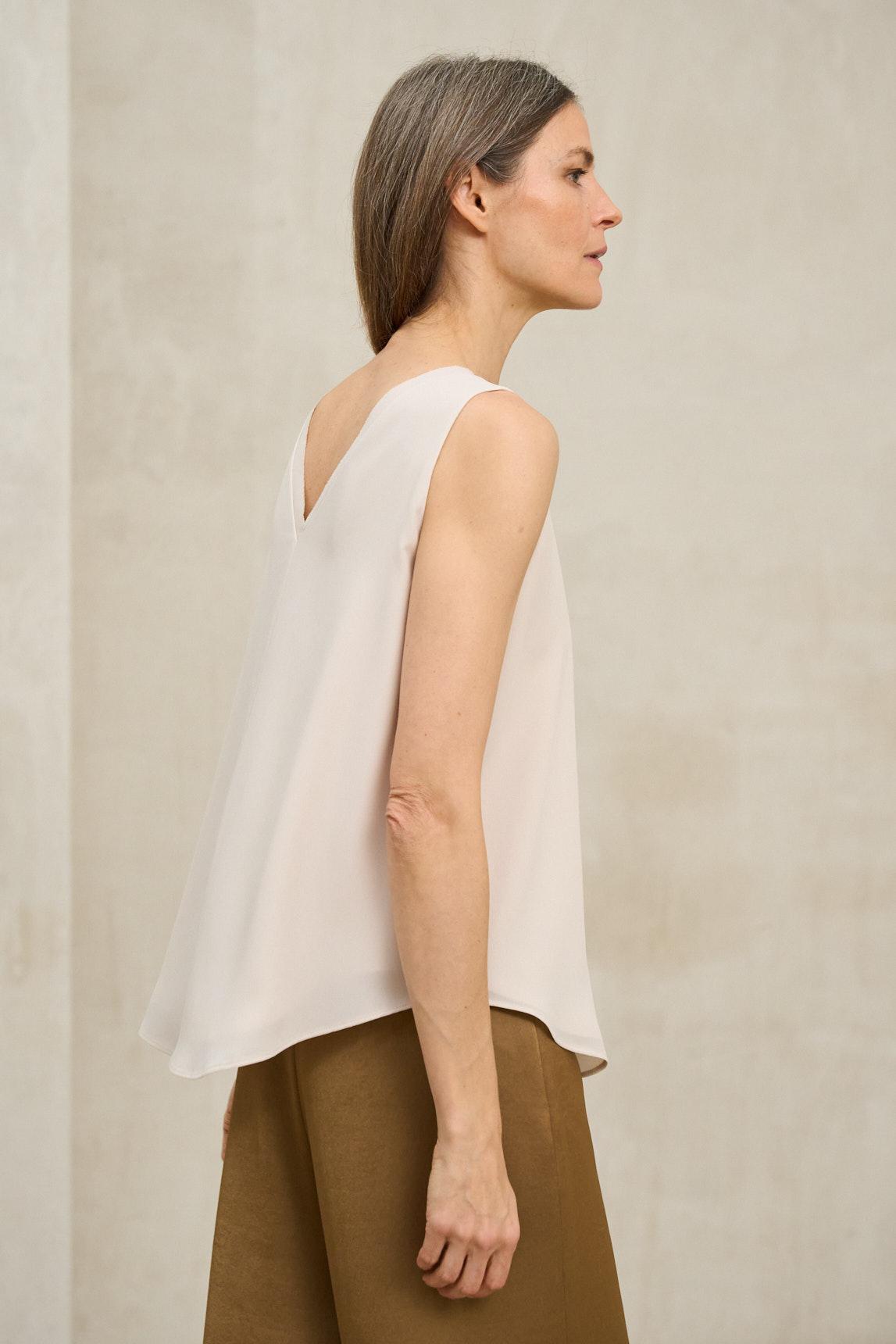 This sleeveless top features a flowing silhouette with a V-neckline both front and back, creating a sleek and lightweight line. The fabric drapes smoothly and continuously, with a soft, delicate finish that gives the garment natural movement. The slightly rounded hem softens the structure and reinforces its relaxed character, while the loose cut allows the top to glide lightly over the body without clinging.
